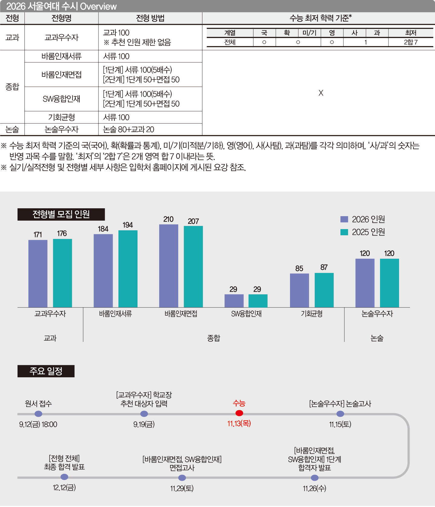 2026학년은 논술전형의 변화가 크다. 최저 기준을 폐지하고 자연 계열 논술을 과학 논술에서 수리 논술로 변경했다. 전형 요소를 줄이고 타 대학과 논술 유형을 통일해 수험생의 부담을 덜어주기 위함이다. 새로운 수리 논술의 출제 과목은 <수학> <수학Ⅰ·Ⅱ>로 문항 난도는 높지 않다. 인문사회 계열 논술은 예년과 동일하게 제시문과 도표를 활용한 통합교과형으로 출제한다. 서울여대 입학처 홈페이지에 게시된 모의논술 자료와 역대 기출문제를 함께 활용해 준비하길 권한다.