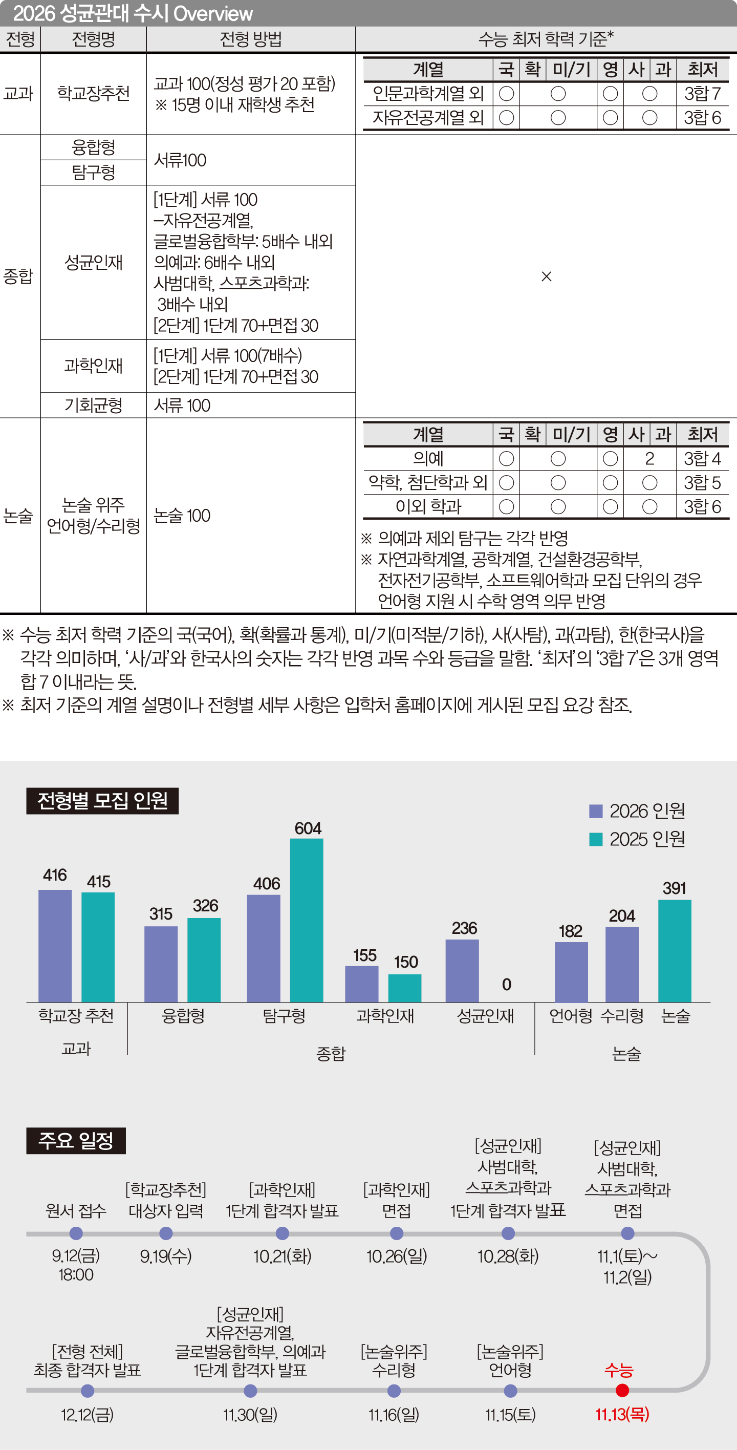 성균관대는 2026학년 수시 모집에서 여러 변화가 있다. 학생부교과전형인 학교장추천은 교과 정량 평가 방식을 일부 변경하고 출결을 반영한다. 학생부종합전형은 면접형 종합전형으로 성균인재전형을 신설했다. 논술전형은 언어형과 수리형으로 분리 선발하면서 논술 시험 날짜를 달리해 중복 지원이 가능하다. 한편 2026학년에도 배터리학과, 바이오신약·규제과학과 등 첨단학과를 신설했다. 성균관대 권영신 입학사정관실장과 정준구 책임입학사정관에게 2026 수시 모집에서 주목해야 할 점을 들었다.