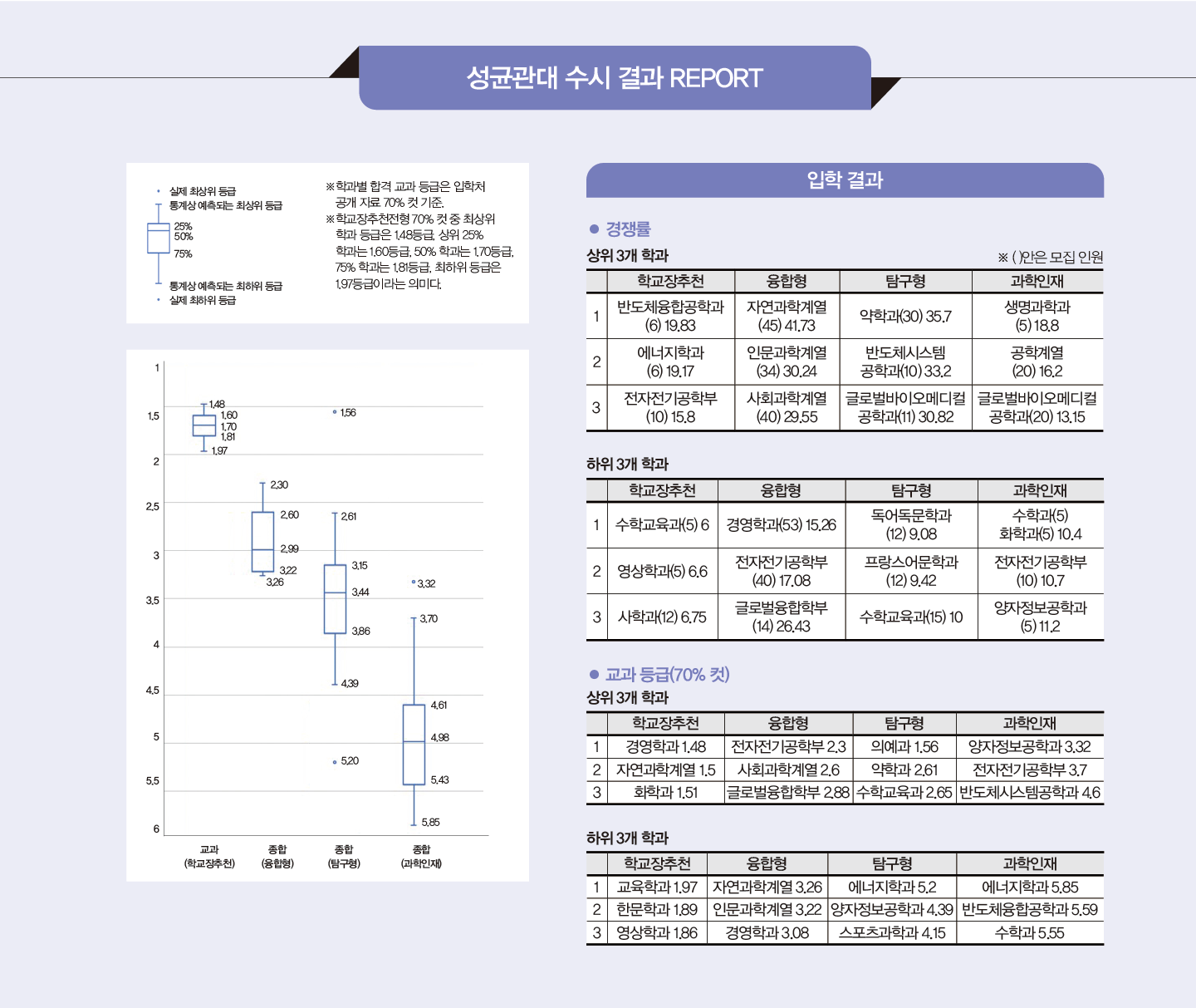 올해도 삼성 SDI 채용 연계형 계약학과인 배터리학과와 융합과학계열 첨단학과인 바이오신약·규제과학과를 신설했다. 해당 학과에 직접적으로 연결되는 활동을 하지 않았다고 지원을 부담스러워할 필요는 없다. 특히나 성균관대는 전공 적합성에 의미 부여를 하지 않기에 학업 역량, 탐구 역량, 잠재 역량을 갖추었다면 도전하길 권한다. 매년 신설 학과의 합격선이 높지 않았던 것도 고려할 만한 부분이다. 성균관대는 대학원에서 운영해온 학과들을 신설 학과로 선발하므로, 교육과정의 내실에 대해선 걱정하지 않아도 된다. 성균관대 입학처 홈페이지에는 ‘성균관대 교수 등판’이라는 입학 안내 영상이 올라와 있다. 교수가 직접 유쾌하고 알기 쉽게 학과를 설명하고 있으니 꼭 시청하길 추천한다.