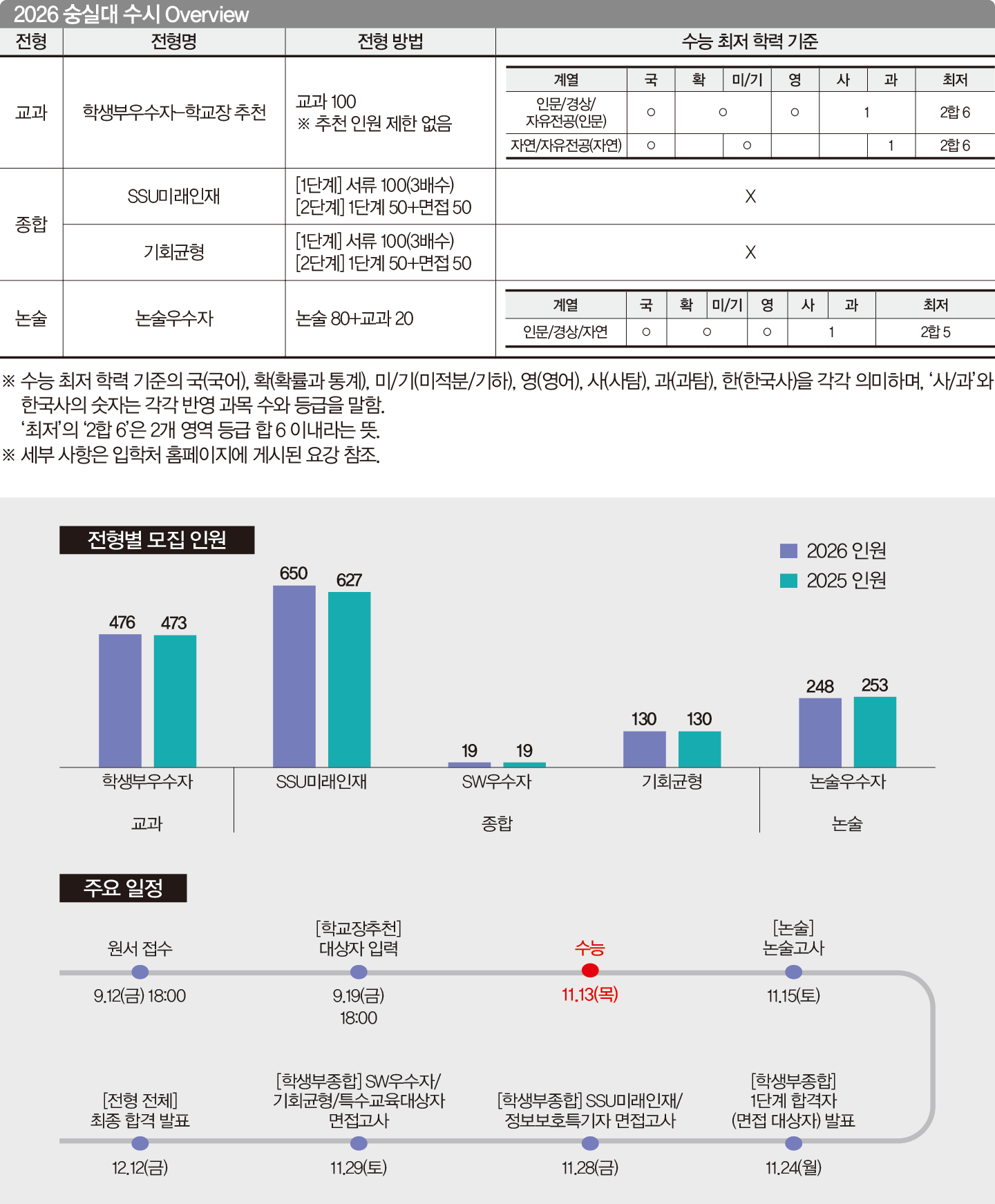 숭실대는 2026학년 수시 모집에서 총 1천719명을 선발한다. 모집 인원 중 자연 계열이 51.0%(877명)로 절반 이상을 차지하며, 인문 계열은 26.4%, 경상 계열은 20.2%이다. 학생부교과전형인 학생부우수자는 교과 반영 방법에서 교과별 반영 비율과 진로선택 과목 수에 따른 비율을 변경했다. 또한, 작년에 완화한 수능 최저 학력 기준을 2개 영역 등급 합 6 이내로 더 완화했다. 자연 계열 및 자유전공학부(자연) 지원자는 최저 기준 반영 시 수학 <미적분> 또는 <기하> 중 1과목과 과학탐구 1과목을 적용한다는 점을 주목해야 한다. 수시전형 가운데 가장 많은 인원을 선발하는 학생부종합전형인 SSU미래인재전형은 최저 기준이 없으며, 1단계는 서류 100%, 2단계는 서류 50%, 면접 50%로 면접 비중이 높은 것이 특징이다. 논술전형은 인문 계열의 출제 과목도 명시돼 있으니 살펴야 한다. 숭실대 문정호 입학사정관에게 올해 수시 지원 시 확인해야 할 주요 사항을 들었다.