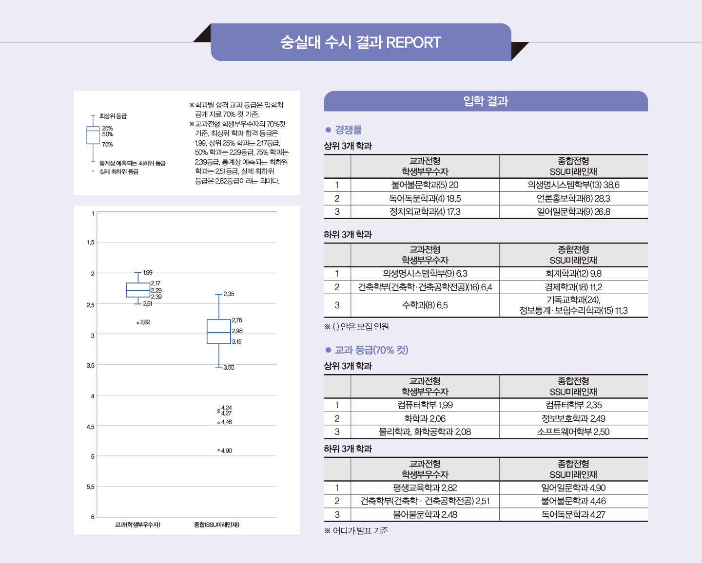 SSU미래인재전형도 16.08:1의 경쟁률을 기록해 높은 선호도를 보였다. 등록자 기준 주요 교과 평균 등급은 2~3등급대에 집중됐다. 특히 자연 계열은 평균 2등급 중·후반에서 형성됐다. 계약학과인 정보보호학과는 2.30등급, 컴퓨터학부는 2.31등급, 소프트웨어학부는 2.52등급으로 높았다. 다만, 인문 계열은 사학과 2.62등급, 영어영문학과 3.46등급, 일어일문학과 3.97등급 등 모집 단위에 따라 등급 격차가 존재했다. SSU미래인재전형은 면접의 비율이 높으므로 철저하게 대비할 필요가 있다.