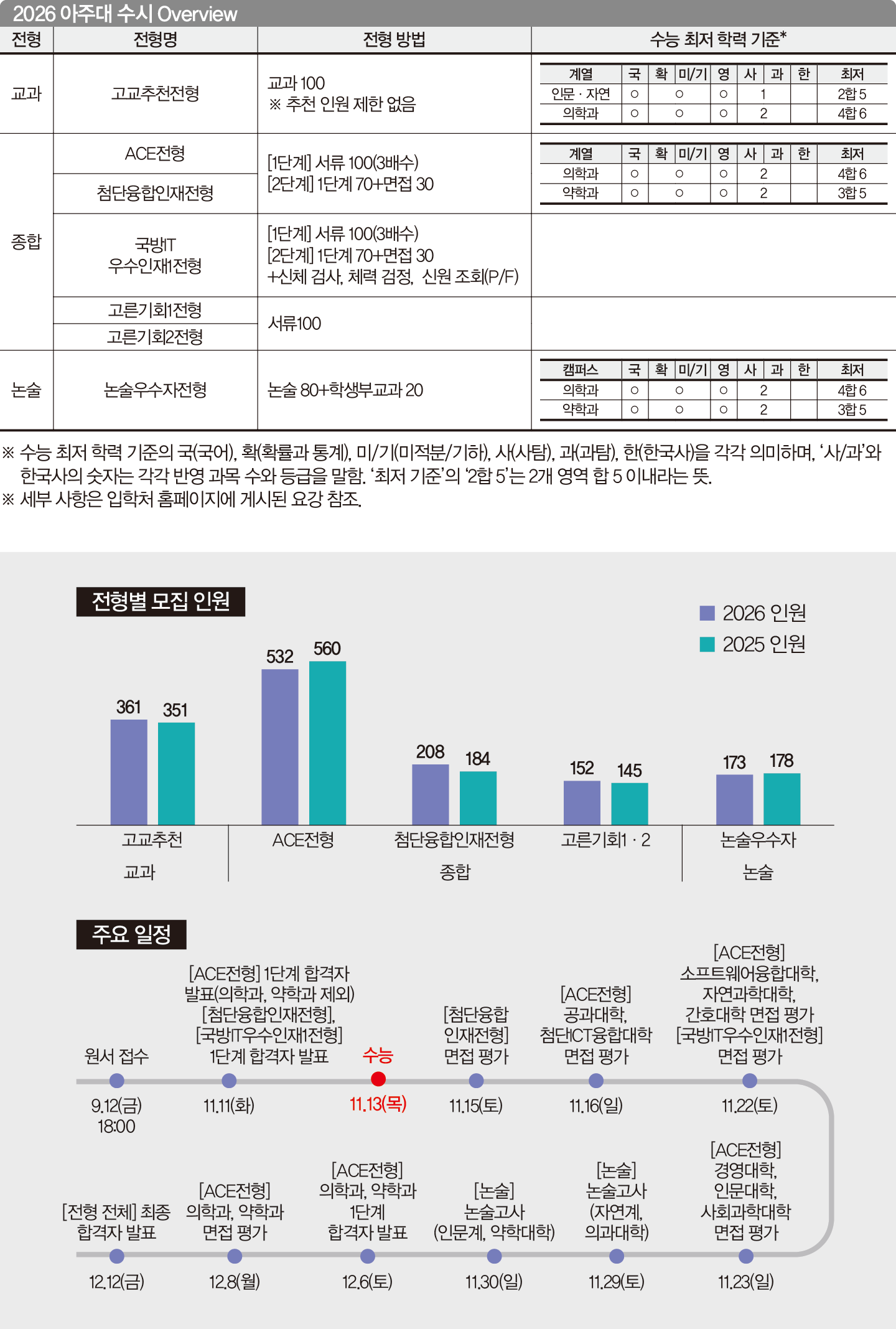 ACE전형과 첨단융합인재전형 모두 단계별 전형으로 1단계에서 100% 서류 평가로 3배수를 선발하고, 2단계에서 1단계 성적 70%에 면접 30%를 반영해 최종 합격자를 선발한다. ACE전형은 아주대의 대표 종합전형으로, 성실하고 책임감 있게 학교생활을 한 학생을 선발하는 것이 목표이다. 의학과와 약학과를 제외한 모든 학과는 최저 기준을 적용하지 않는다.