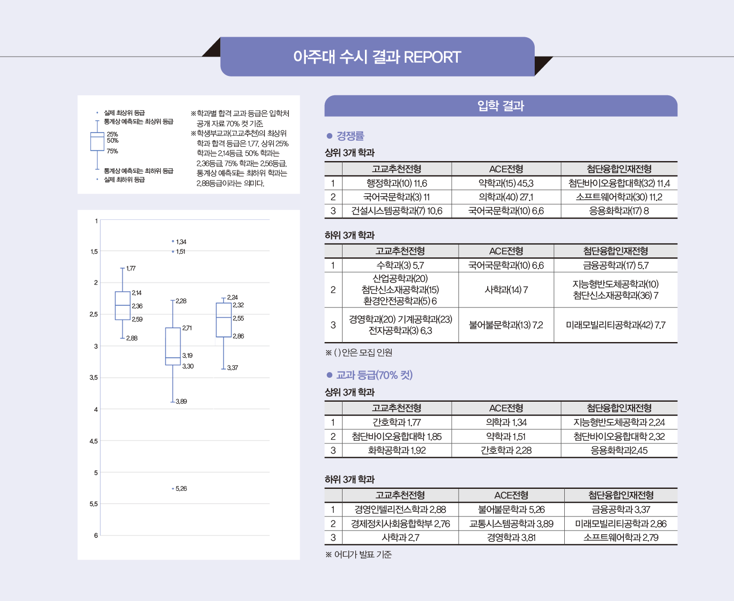 특히 의학과의 입학 정원이 40명에서 110명으로 증가했는데, 그 영향으로 의약학 계열에 관심이 높아진 것을 확인할 수 있었다. 아주대 논술전형은 매년 높은 경쟁률을 나타냈는데 2025학년에는 91.9:1로 전년 86.5:1보다 크게 상승했다. 특히 논술전형으로 처음 선발한 약학과는 882.61:1이라는 전국 최고 경쟁률을 나타냈다. 최저 기준 충족률은 51.0%로, 2024학년 51.6%와 거의 비슷했다.