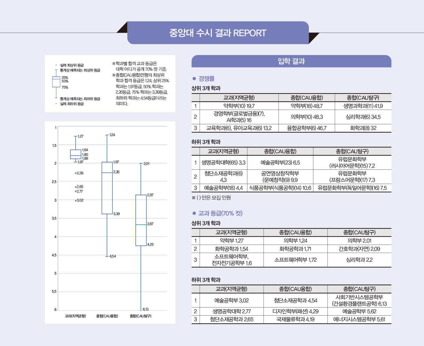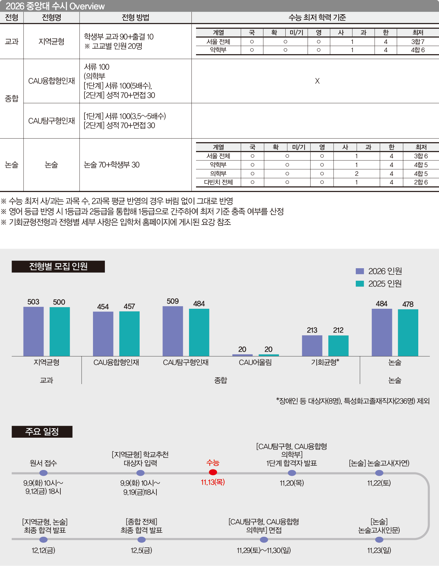 종합전형은 CAU융합형인재와 CAU탐구형인재 두 가지 트랙으로 운영하며 각각 다른 역량을 지닌 학생을 선발한다. 융합형인재는 100% 서류로 선발하며 올해부터 의학부만 별도로 2단계 면접을 진행한다. 교과 및 학업 활동에서 고르게 우수한 성과를 보이고, 다양한 학교 활동에 자기 주도적으로 참여한 경험이 있으며, 리더십과 협력, 나눔과 배려를 실천한 학생을 선발하고자 한다. 탐구형인재는 1단계 서류로 3.5~5배수를 학과별로 선발하고 2단계에서는 1단계 70%, 면접 30%를 반영한다. 학업 역량의 반영 비율이 40%로 상대적으로 낮아 50%를 반영하는 융합형인재에 비해 합격자의 내신 등급은 낮게 형성된다. 특정 전공(계열) 분야에 대한 깊이 있는 탐구 능력을 중시하며 지적 호기심이 뛰어나고 전공 관련 교과 및 활동에서 탁월한 성과를 거둔 학생, 해당 분야 활동에 꾸준히 참여하며 성취를 이룬 학생을 선발한다.