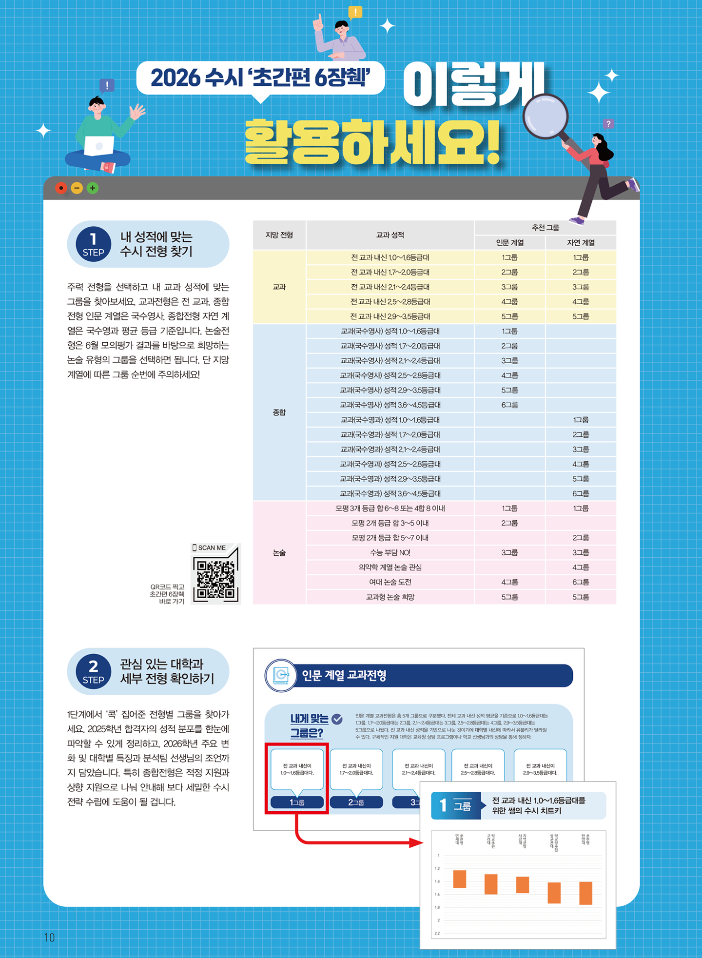 2026학년 수시에 지원할 수험생을 돕기 위해 공교육 진학 전문 교사들로 구성된 분석팀과 함께 수도권 대학의 교과·종합·논술전형을 뜯어봤습니다. 학생 성향을 인문·자연 계열로 크게 구분한 뒤 교과 성적을 기준으로 5~6그룹을 세분화해 지원해볼 만한 대학·전형을 안내합니다. 교과 성적의 영향력이 적은 논술전형은 수능 최저 학력 기준 충족 여부를 중심으로 그룹을 나눴습니다. 간단하고 편리하게 자신의 수시 지원 원서를 점검해보세요!