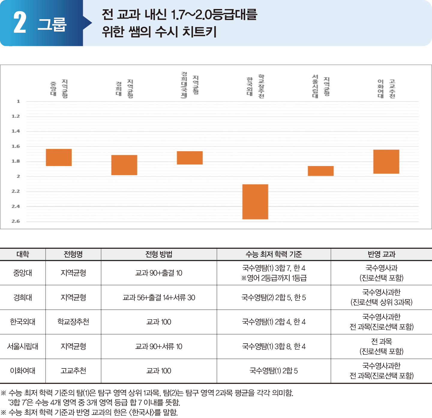 2그룹 대학의 교과전형은 최저 기준에서 3개 영역을 반영하는 대학과 2개 영역을 반영하는 대학으로 나뉜다. 2개 영역을 반영하는 경우 3개 영역보다 수험생의 최저 기준 충족에 대한 부담이 줄어들기에 지원자가 늘고 합격자의 교과 성적도 상승한다.  2그룹은 서울시립대를 제외하면 국영수사과의 주요 교과만 반영하는 특징이 있다. 단 진로선택 과목의 반영 방법은 대학마다 상이하다. 등급 평균으로는 대학 지원선만 결정하고, 세부 전략은 대학별 환산점을 따져 결정하자.