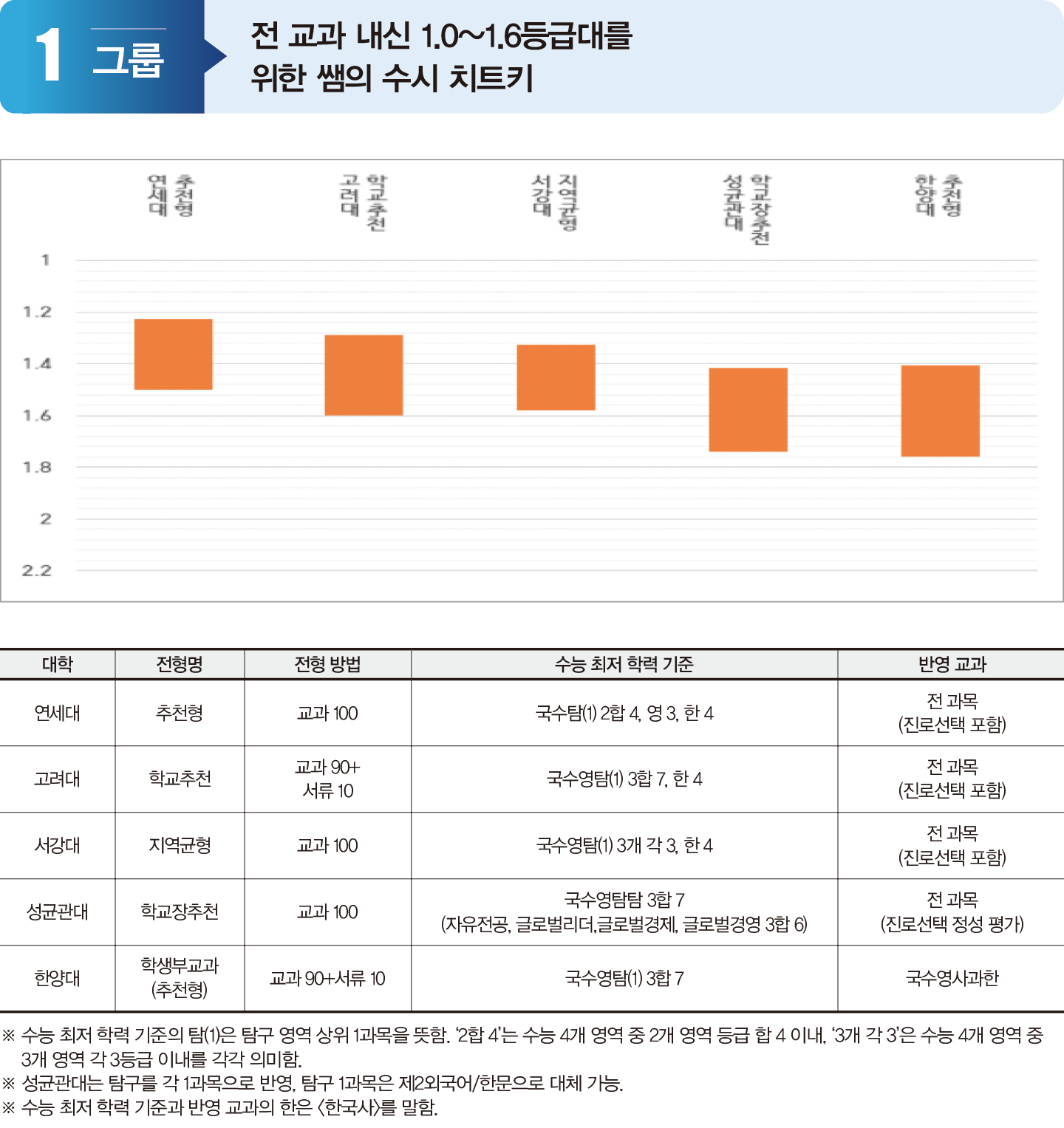 1그룹 대학의 교과전형은 최저 기준에서 3개 영역의 등급 합을 요구한다. 충족이 까다로워 실제 합격선에서는 대학별, 학과별 내신 성적의 편차가 있을 수 있다. 특히 인문 계열 수험생의 경우 수학 영역으로 인해 수능에서 최저 충족률이 상대적으로 낮은 편이다.  한편 자연 계열의 높은 교과 등급을 받은 학생들도 인문 계열 모집 단위를 지원할 수 있으므로 일부 모집 단위의 합격선이 상승할 가능성이 있다. 다만, 고려대와 한양대는 교과 성적만 반영하는 것이 아니라 과목 이수 등도 평가한다. 자연 계열 성향 학생이 인문 계열 모집 단위에 교차지원 했을 때, 교과 성적이 높다고 유리하다고 단정할 수 없다는 얘기다.  1그룹에 속한 대학은 대학별 교과 환산 방식을 반드시 확인해야 한다. 특히 진로선택 과목 반영 비중이 높을수록 실제 합격자의 교과 환산점은 더 상승할 수 있음을 유념하자.