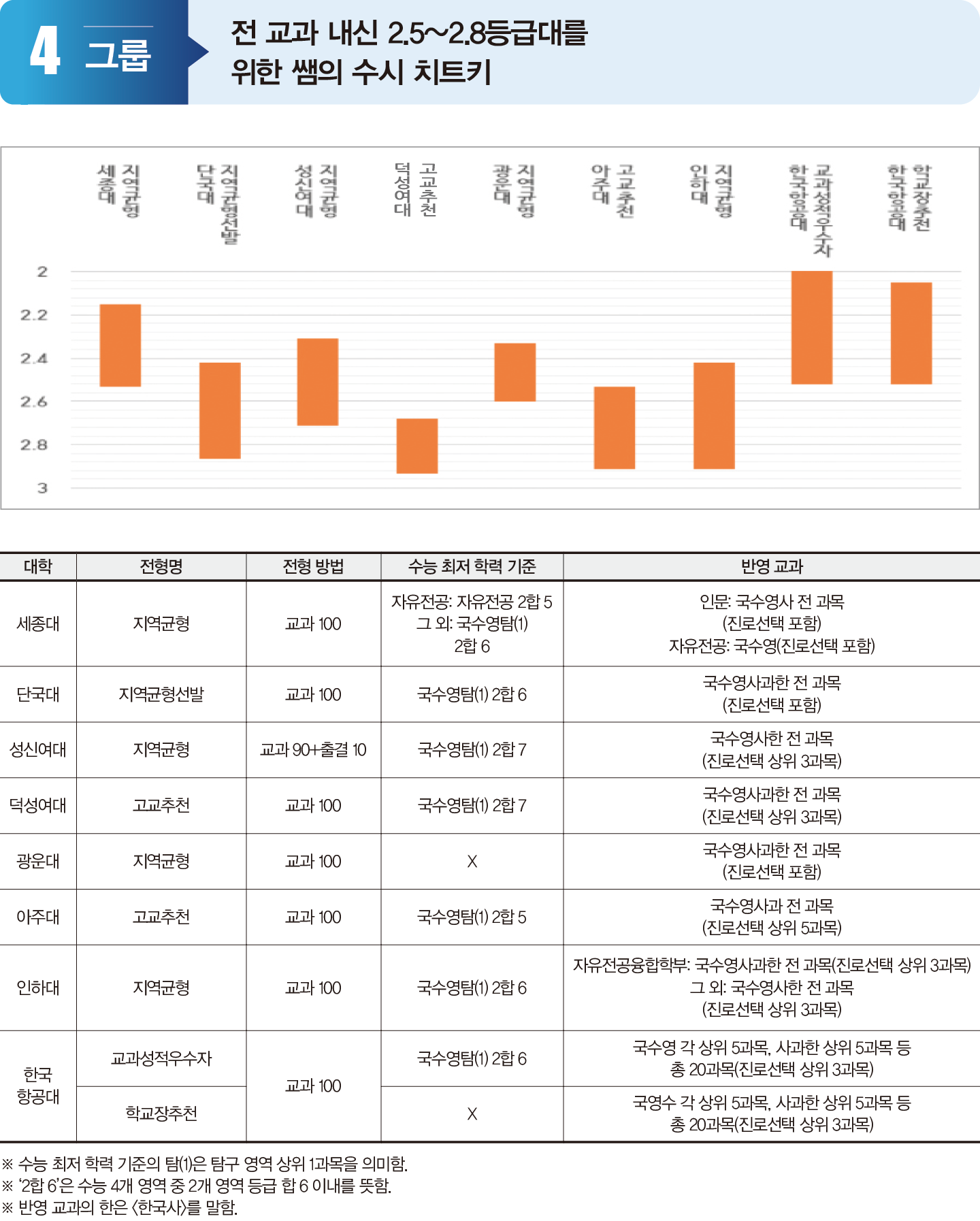 4그룹은 수능 2개 영역에서 각각 3, 4등급을 확보하면 최저 기준을 충족할 수 있는 대학이다. 합격자 교과 성적은 대개 2등급대에 형성된다. 4그룹 대학은 최저 기준이 흡사해 대학 및 모집 단위 선호도에 따라 합격선이 달라진다. 광운대의 지역균형전형과 한국항공대의 학교장추천전형은 최저 기준이 없다. 내신 성적은 비교적 우수하지만 수능에 자신 없는 수험생이 지원할 수 있어 교과 성적이 높게 형성될 수 있음을 유의하자. 아주대와 세종대 자유전공은 4그룹에 속해 있지만 최저 기준은 2그룹의 경희대, 이화여대와 비슷하고 3그룹 대학보다 높은 수준이다. 마지막까지 수능 대비를 충실히 해야 합격 가능성을 높일 수 있다.
