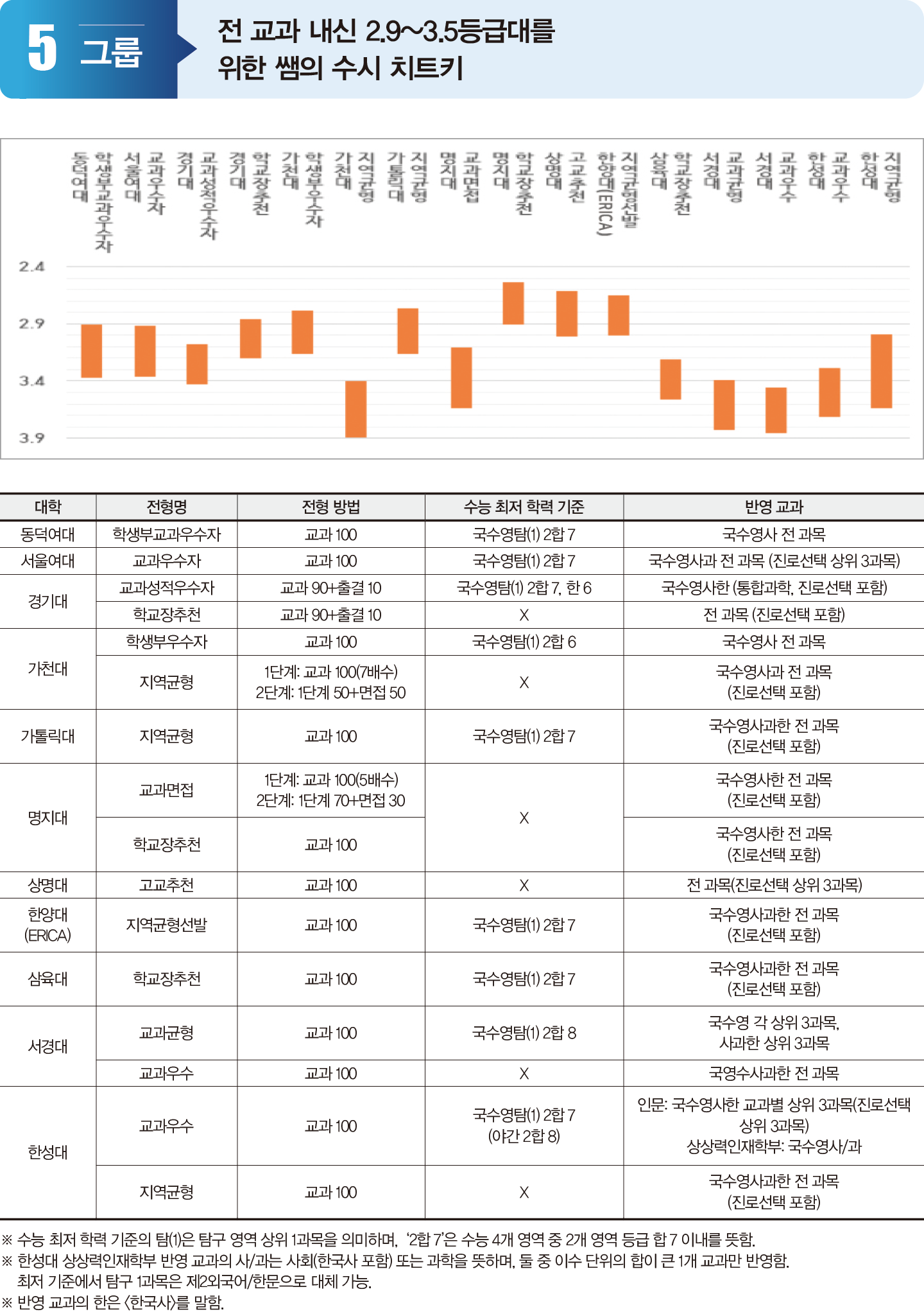 5그룹은 수능 2개 영역 등급 합 6~8 이내를 확보하면 최저 기준을 충족할 수 있는 대학이 많다. 합격자 교과 성적은 3등급대에 형성된다. 최저 기준이 비슷해 대학 및 모집 단위 선호도에 따라 합격선이 달라지며, 모집 단위에 따라 합격선 편차가 크다. 특히 5그룹은 경기대 가천대 명지대 서경대 한성대 등 교과전형을 2개로 운영하는 대학이 많다.  한편 최저 기준이 있는 대학보다 최저 기준이 없는 대학의 충원율이 상대적으로 낮은 경향을 보인다. 최저 기준이 설정된 수도권 대학의 교과전형과 지원층이 겹치지 않는다고 볼 수 있다. 또 최저 기준이 없는 전형에서 선호도가 높은 모집 단위는 최초 합격자 성적이 꽤 높게 형성된다. 이 그룹의 대학은 지원하는 수험생에게 대개 가장 안정적인 지원 카드로 여겨지기 때문이다. 따라서 단순히 최종 등록자의 교과 성적만으로 합불을 예측하는 것은 위험하다.