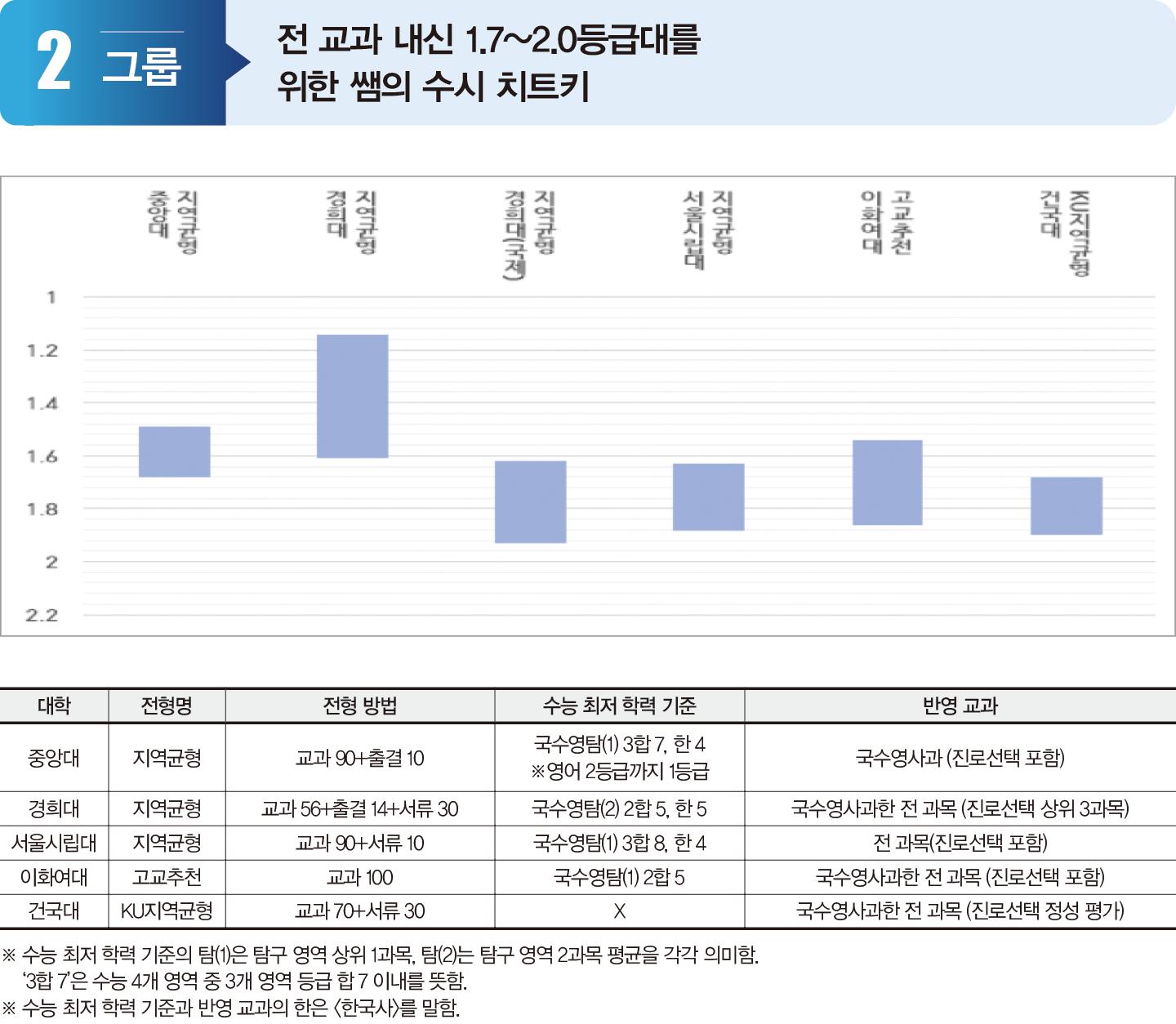 2그룹 대학의 교과전형은 최저 기준에서 3개 영역을 반영하는 대학과 2개 영역을 반영하는 대학으로 나뉜다. 2개 영역을 반영하는 경우 3개 영역보다 수험생의 최저 기준 충족에 대한 부담이 줄어들기에 지원자가 늘고 합격자의 교과 성적도 상승한다. 대부분 전 교과 전 과목을 반영했던 1그룹과 달리 2그룹은 서울시립대를 제외하면 국영수사과의 주요 교과만 반영하는 특징이 있다. 단 진로선택 과목의 반영 방법은 대학마다 상이하다. 등급 평균으로는 대학 지원선만 결정하고, 세부 전략은 대학별 환산점을 따져 결정하자.