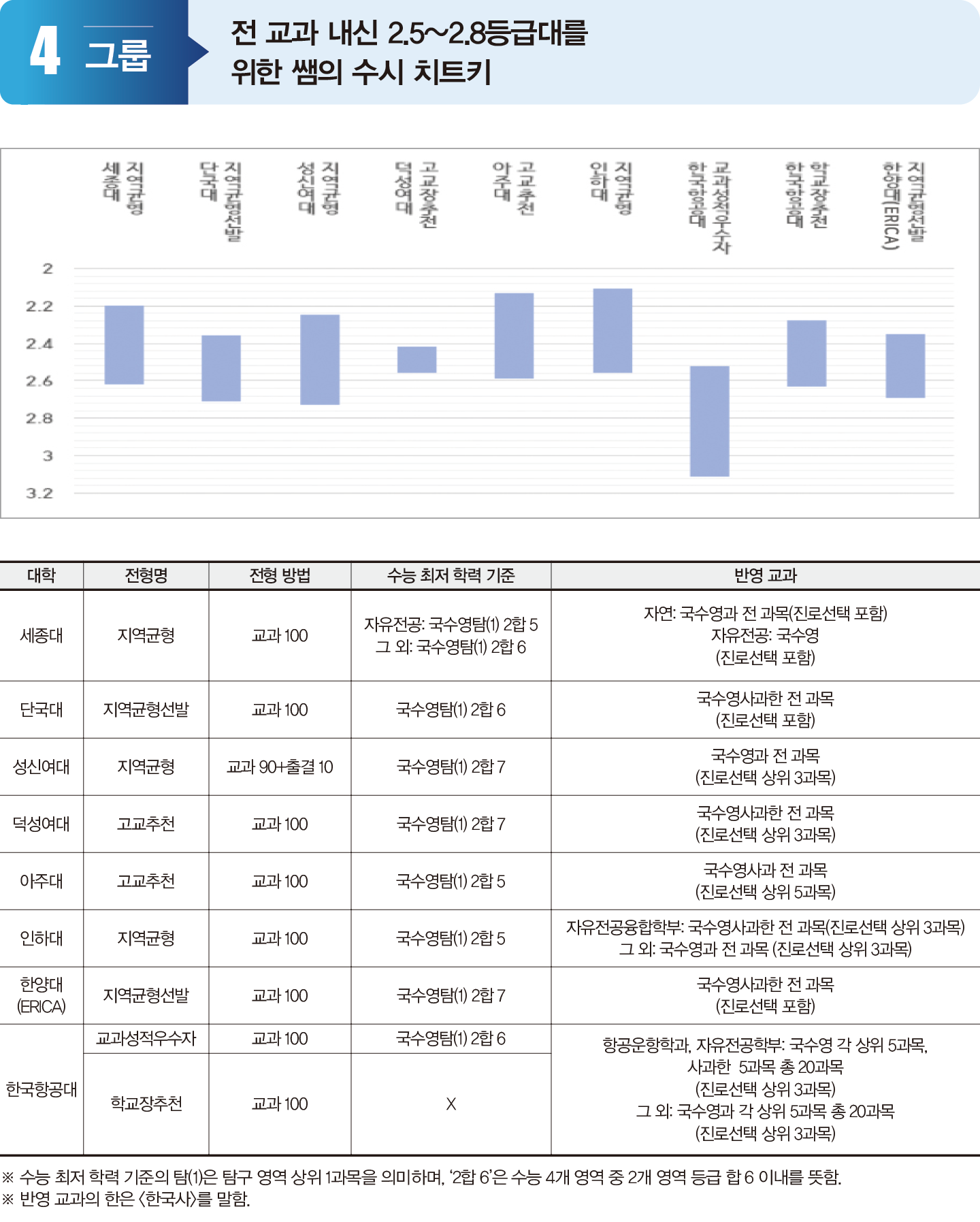 4그룹은 수능 2개 영역에서 각각 3, 4등급을 확보하면 최저 기준을 충족할 수 있는 대학이다. 합격자 교과 성적은 대개 2등급대에 형성된다. 4그룹 대학은 최저 기준이 흡사해 대학 및 모집 단위 선호도에 따라 합격선이 달라진다. 한국항공대의 학교장추천전형은 최저 기준이 없다. 내신 성적은 비교적 우수하지만 수능에 자신 없는 수험생이 지원할 수 있어 합격생의 교과 성적이 높게 형성될 수 있음을 유의하자. 아주대와 세종대 자유전공은 4그룹에 속해 있지만 최저 기준은 2그룹의 경희대, 이화여대와 비슷하고 3그룹 대학보다 높은 수준이다. 마지막까지 수능 대비를 충실히 해야 합격 가능성을 높일 수 있다.