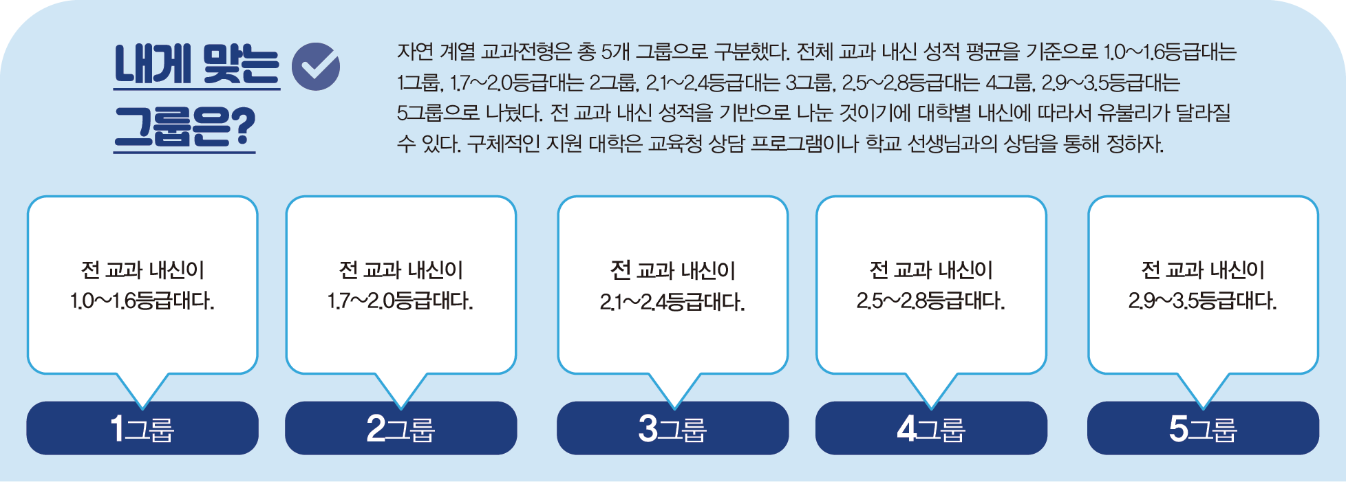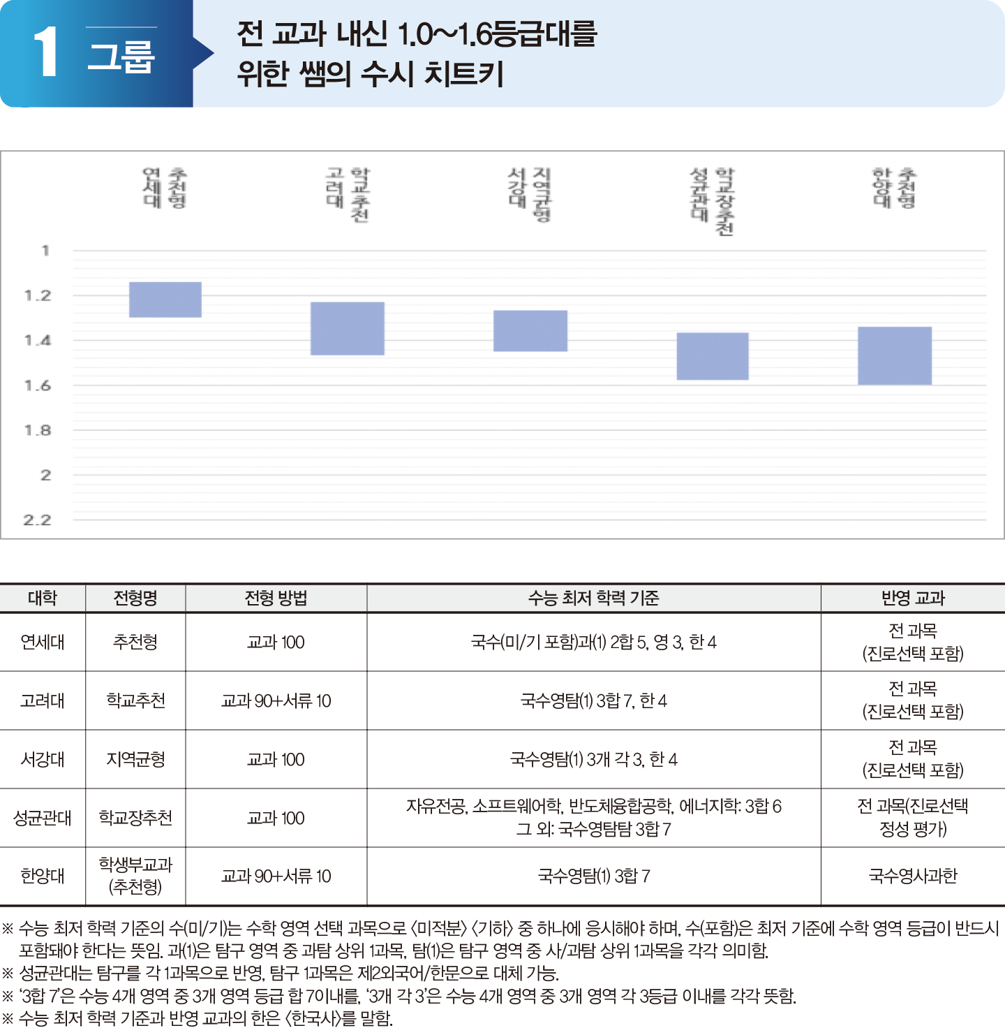 1그룹 대학의 교과전형은 수능 최저 학력 기준에서 3개 영역의 등급 합을 요구한다. 충족이 까다로워 실제 합격선에서는 대학별, 학과별 편차가 커질 수 있다. 다만 자연 계열 수험생의 최저 충족률은 상대적으로 높은 편이다. 한편 자연 계열은 최저 기준에서 수학 영역, 탐구 영역의 선택 과목을 지정하는 대학이 있어 사전에 조건을 확인해야 한다. 고려대와 한양대는 교과 성적만 반영하는 것이 아니라 과목 이수 등도 평가하기에 교과 성적이 높은 것으로 유리하다고 단정할 수 없다. 1그룹에 속한 대학은 학생이 이수한 과목 중 석차 등급이 표시되는 전 과목을 반영하고, 진로선택 과목도 대학별 기준에 따라 반영하므로 대학별 교과 환산 방식을 반드시 확인해야 한다. 특히 진로선택 과목 반영 비중이 높을수록 실제 합격자의 교과 환산점은 더 상승할 수 있음을 유념하자.