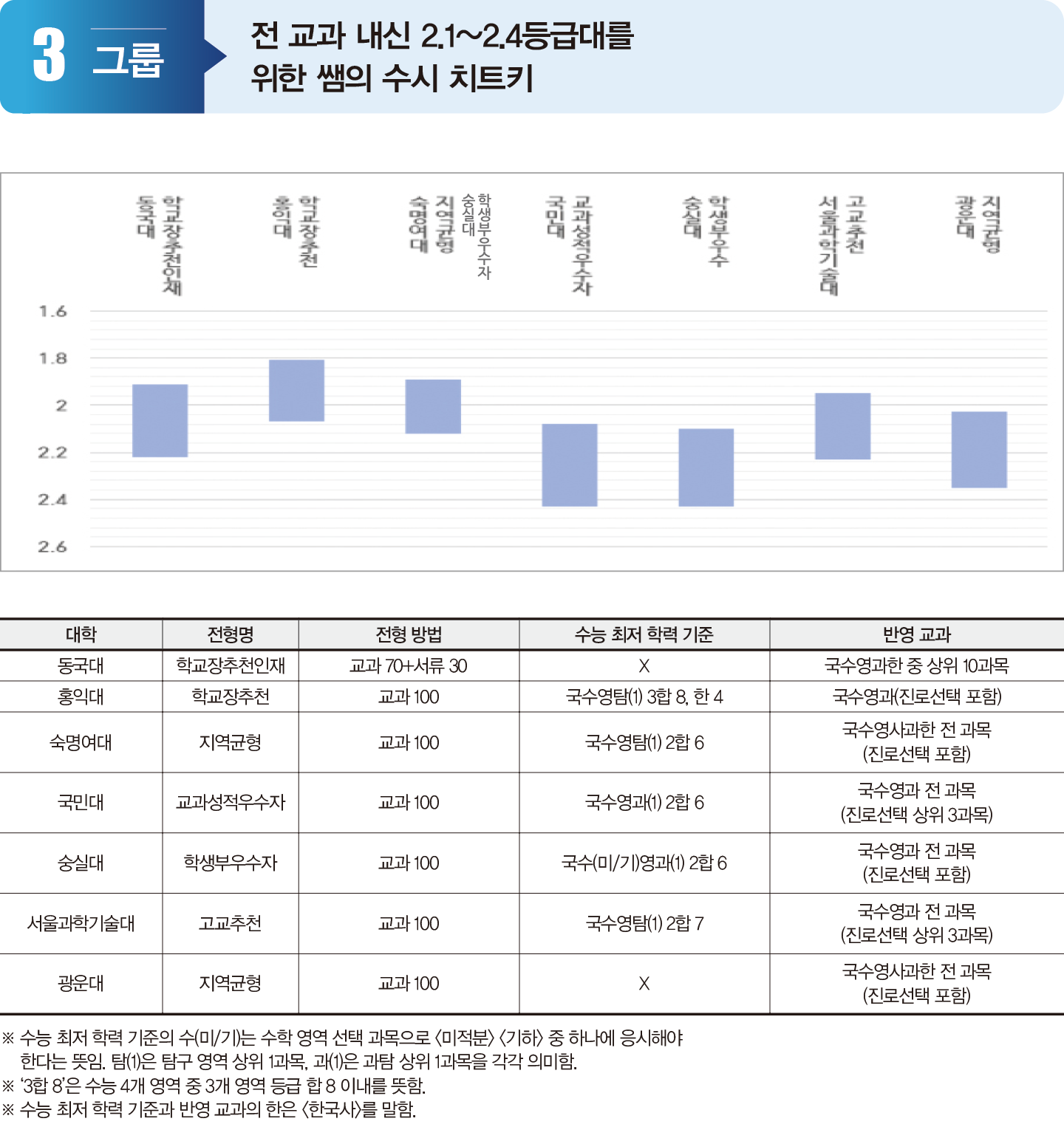 3그룹은 홍익대를 제외한 대부분이 수능 2개 영역에서 각각 3, 4등급을 확보하면 최저 기준을 충족할 수 있는 서울권 대학이다. 1, 2그룹에 비해 최저 기준 충족이 비교적 수월해 합격자의 교과 성적이 2등급대에 형성된다. 다만 최저 기준에 대한 부담이 낮아 지원자가 늘어남에 따라 1, 2그룹의 합격선과 큰 차이가 없다. 특히 올해는 국민대 숙명여대 숭실대의 최저 기준 완화로 3그룹 대학이 늘었다. 다만, 국민대와 숭실대는 탐구 영역을 최저 기준 충족에 활용하려면 과탐 1과목이 포함되어야 하며, 숭실대는 수학 영역을 최저 기준에 반영할 경우 선택 과목으로 <미적분> <기하> 중 하나를 응시해야 한다. 동국대와 광운대 1~3그룹에서 최저 기준이 없는 몇 안 되는 대학이다. 모의고사 성적은 다소 아쉽지만 내신 성적이 좋은 수험생의 지원이 몰려 경쟁이 아주 치열하고 입결도 비교적 높게 형성된다는 점을 유의하자.