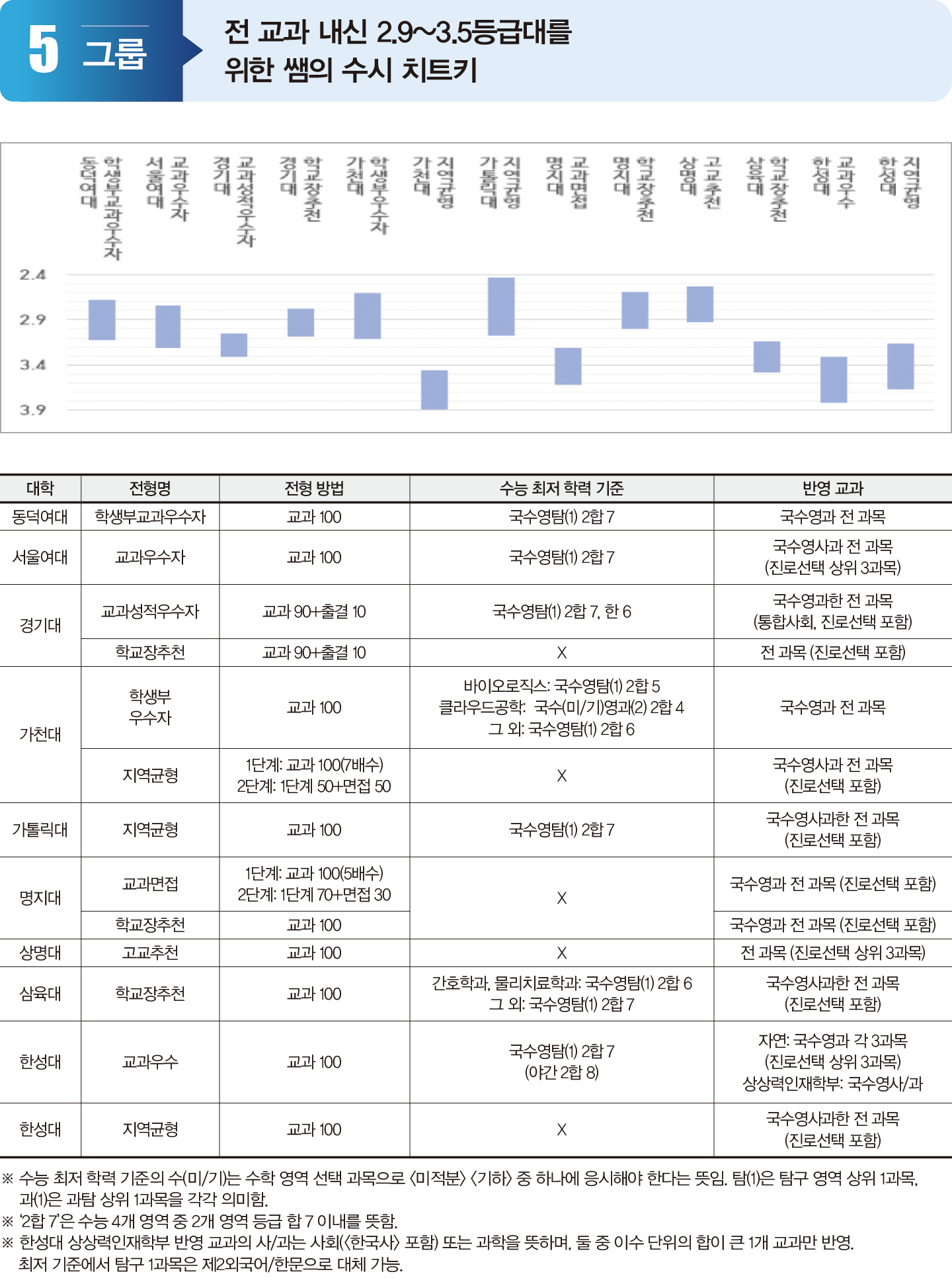 5그룹은 수능 2개 영역 합 6~8등급을 확보하면 최저 기준을 충족할 수 있는 대학이 많다. 합격자 교과 성적은 3등급대에 형성된다. 최저 기준이 비슷해 대학 및 모집 단위 선호도에 따라 합격선이 달라지며, 모집 단위에 따라 합격선 편차가 크다. 특히 5그룹은 경기대 가천대 명지대 서경대 한성대 등 교과전형을 2개로 운영하는 대학이 많다. 한편 최저 기준이 있는 대학보다 최저 기준이 없는 대학의 충원율이 상대적으로 낮은 경향을 보인다. 최저 기준이 설정된 수도권 대학의 교과전형과 지원층이 겹치지 않는다고 볼 수 있다. 한편 최저 기준이 없는 전형에서 선호도가 높은 모집 단위는 최초 합격자 성적이 꽤 높게 형성된다. 이 그룹의 대학은 지원하는 수험생에게 대개 가장 안정적인 지원 카드로 여겨지기 때문이다. 따라서 단순히 최종 등록자의 교과 성적만으로 합불을 예측하는 것은 위험하다.