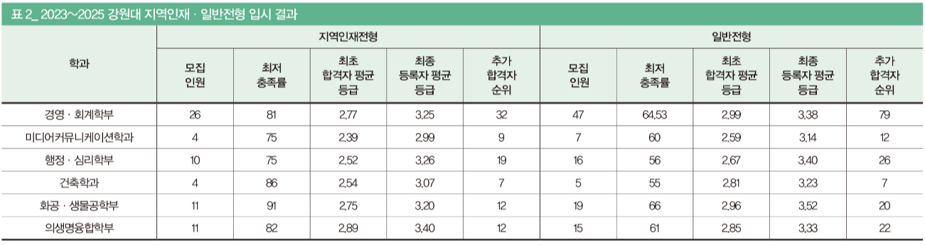 의학 계열 외 일반학과 지역인재전형은 지역 거점 국립대인 강원대의 인기가 높다. 강원대 수시에서 중상위권 수험생이 집중 지원하는 인문·자연 계열 선호도 상위 학과의 최근 3개년 교과전형 입시 결과 데이터를 살펴보면, 지역인재전형이 일반전형보다 대체로 합격자 평균 성적이 높았다. 지역인재전형은 최저 충족률이 높은 편이며, 최저 기준 자체도 대체로 일반전형보다 다소 완화돼 있다는 점을 고려할 때, 강원권 수험생은 지역인재전형와 일반전형의 중복 지원을 적극 고려할 만하다.  전형별 특징을 보면, 강원대 지역인재전형은 강원권 상위권 학생을 겨냥해 설계된 만큼 입결이 높고, 최저 충족률도 높은 편이다. 반면 일반전형은 전국에서 지원하기에 경쟁이 분산되며, 합격선도 다소 완화되는 경향이 있다. 특히 일반전형은 최저 충족률이 지역인재전형보다 낮고 충원 비율은 높아 추가 합격 기회가 넓다는 장점이 있다. 강원권 학생 수 감소로 인해 지역인재전형의 경쟁률은 학과마다 차이는 있지만 전반적으로 감소세를 보인다.