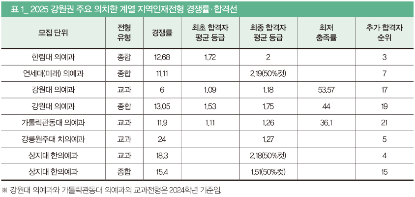 수능 최저 학력 기준의 경우 한림대는 국어, 영어, 수학, 과학탐구(2과목 평균) 4개 영역 중 3개 등급 합 4 이내(단, 영어 포함 시 영어 1등급), 연세대(미래)는 국어, 수학, 영어, 과탐(2과목 평균) 중 수학을 포함해 3개 영역 등급 합 5 이내로 상대적으로 높은 편이다. 최저 충족률과 충원율 또한 낮다. 따라서 학생부가 우수하고 최저 기준을 충족할 수 있다면 교과 내신 등급이 다소 낮아도 도전해볼 만하다. 2025학년은 의대 정원 증원 여파로 가톨릭관동대와 강원대 의예과가 지역인재전형으로 많은 인원을 선발했지만, 올해는 2024학년 수준으로 모집 정원이 회귀했다. 이에 맞춰 지원 전략을 새롭게 설계할 필요가 있다.