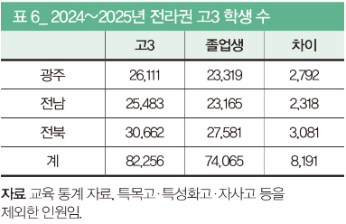일반전형과 지역인재의 입시 결과의 차이가 있기 때문에 지역인재를 지원해보는 것이 지역 학생에게는 훨씬 더 유리하다. 광주·전남 지역의 학생들에게는 한 장의 카드를 더 쓸 수 있기 때문에 지원 전략을 세울 때 잘 고려해볼 필요가 있다. 한편 올해 대입을 치를 고3 학생 수는 전국적으로 크게 증가했다. 전라권도 마찬가지다(표 6). 교육 통계 자료의 일반계고 고3 학생 수가 전년 대비 8천191명 많다. 이에 따른 경쟁률 및 합격선 상승이 예상된다.