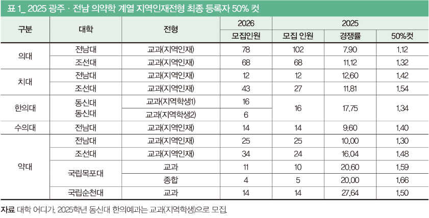2026학년 광주·전남권 의대는 수시 모집 인원 93명 중 교과(지역인재)로 78명을 모집한다. 의대 정원이 2024학년 수준으로 회귀함에 따라 전년 대비 모집 인원은 줄었다. 따라서 경쟁률이 대폭 상승할 전망이다. 동신대 한의예과는 국어·수학·영어·탐구(상위 1과목) 중 3개 영역 등급 합 5 이내로 수학이 필수가 아니다. 다른 과목에 비해 수학이 약한 학생이라면 눈여겨봐야 한다. 또한 2026학년 전형부터 지역인재1(광주·전남), 지역인재2(광주·전남·전북)으로 구분해 선발한다.