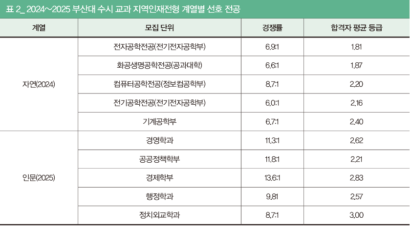 이는 상위권 학생이 보다 범용성과 선호도가 높은 전공에 몰리는 현상을 보여준다. 인문사회 계열에서는 부산대 경영학과가 꾸준히 높은 선호도를 유지했다. 2025 지역인재전형에서 경쟁률 11.3:1, 합격자 평균 2.62등급을 기록했다. 공공정책학부는 소수 인원 모집임에도 불구하고 경쟁률 11.8:1에 평균 2.21등급이라는 매우 높은 성적을 보였다는 점이 눈에 띈다. 공공부문 취업에 대한 수요가 반영된 것으로 풀이된다. 같은 맥락에서 행정학과와 정치외교학과 지원자도 많았다.