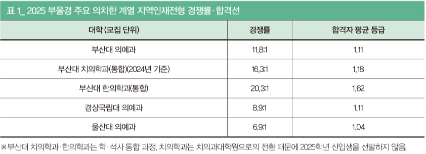 부산대뿐 아니라 권역 내 다른 의대도 우수한 지원자가 몰렸다. 경상국립대 의예과는 경쟁률 8.9:1·합격자 평균 1.11등급, 울산대 의예과는 6.9:1, 1.04등급으로 전국 최상위 수준의 성적을 기록했다.