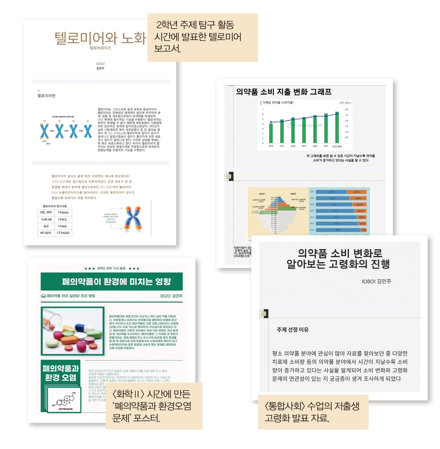 <통합사회> ‘의약품 소비 변화로 알아보는 고령화의 진행’이라는 주제로 우리나라의 고령화에 따른 의약품 소비량 변화를 고찰함. 2016년부터 5년간 가계당 의약품 소비 지출량 변화, 의약품을 지출하는 노인의 비중을 조사함 <과학탐구실험> 인류를 살린 항생제에 대해 조사·발표함