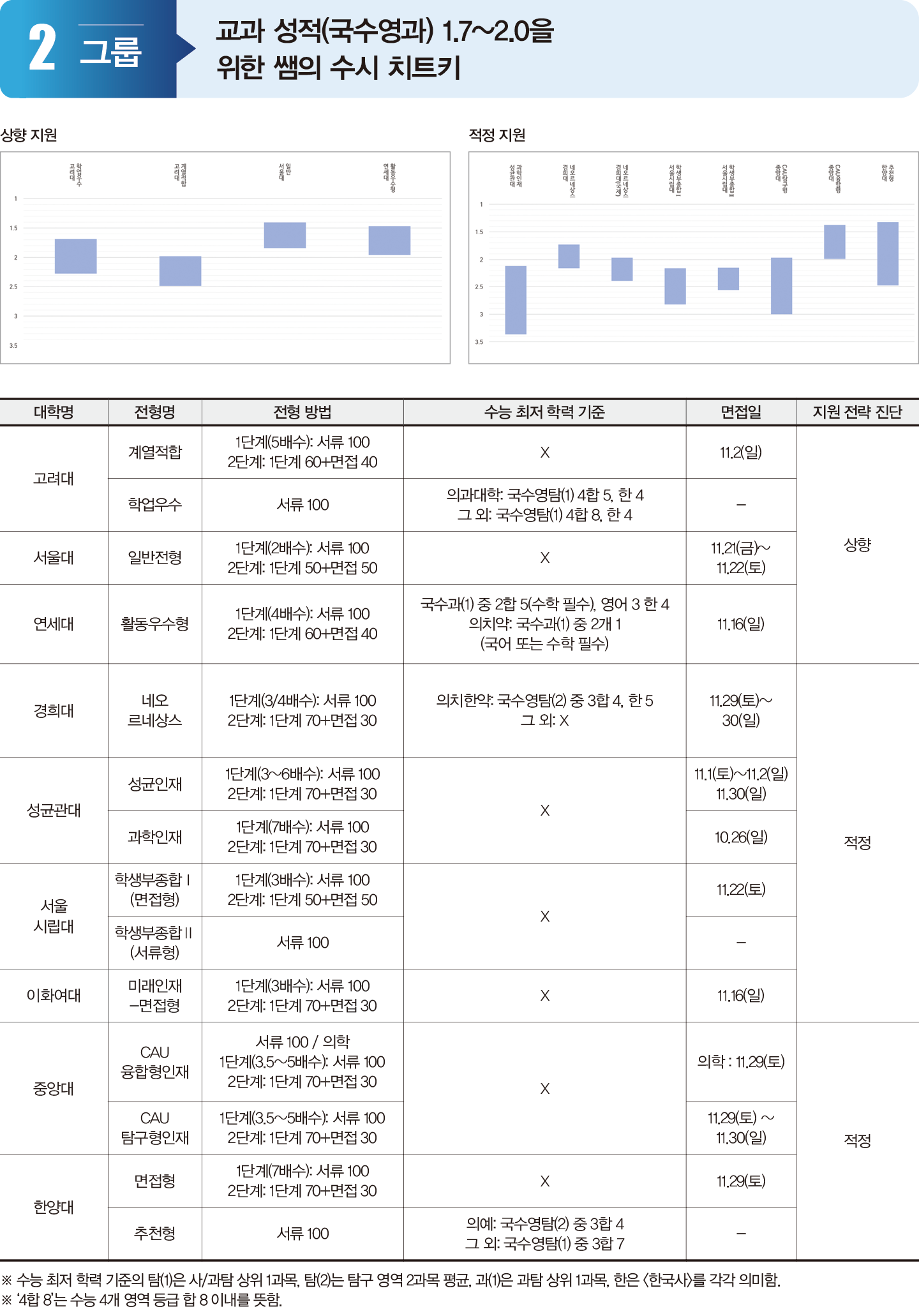 2그룹 지원자의 교과 성적은 1그룹 대학에 지원하기에 충분하다. 다만 1그룹과의 경쟁에서 합격을 거머쥐려면 면접과 최저 기준 등 추가적인 전형 요소에서 승부를 보아야 한다. 고려대 학업우수전형처럼 최저 기준이 높은 전형은 최저 기준 충족자가 많지 않아 내신의 불리함을 극복할 기회를 얻을 수 있다. 서울대 일반전형은 제시문 면접이 50%나 포함되며 변별력이 매우 커서 지원자의 장점에 따라서 2그룹에서도 상향 지원 전략을 세울 수 있다.