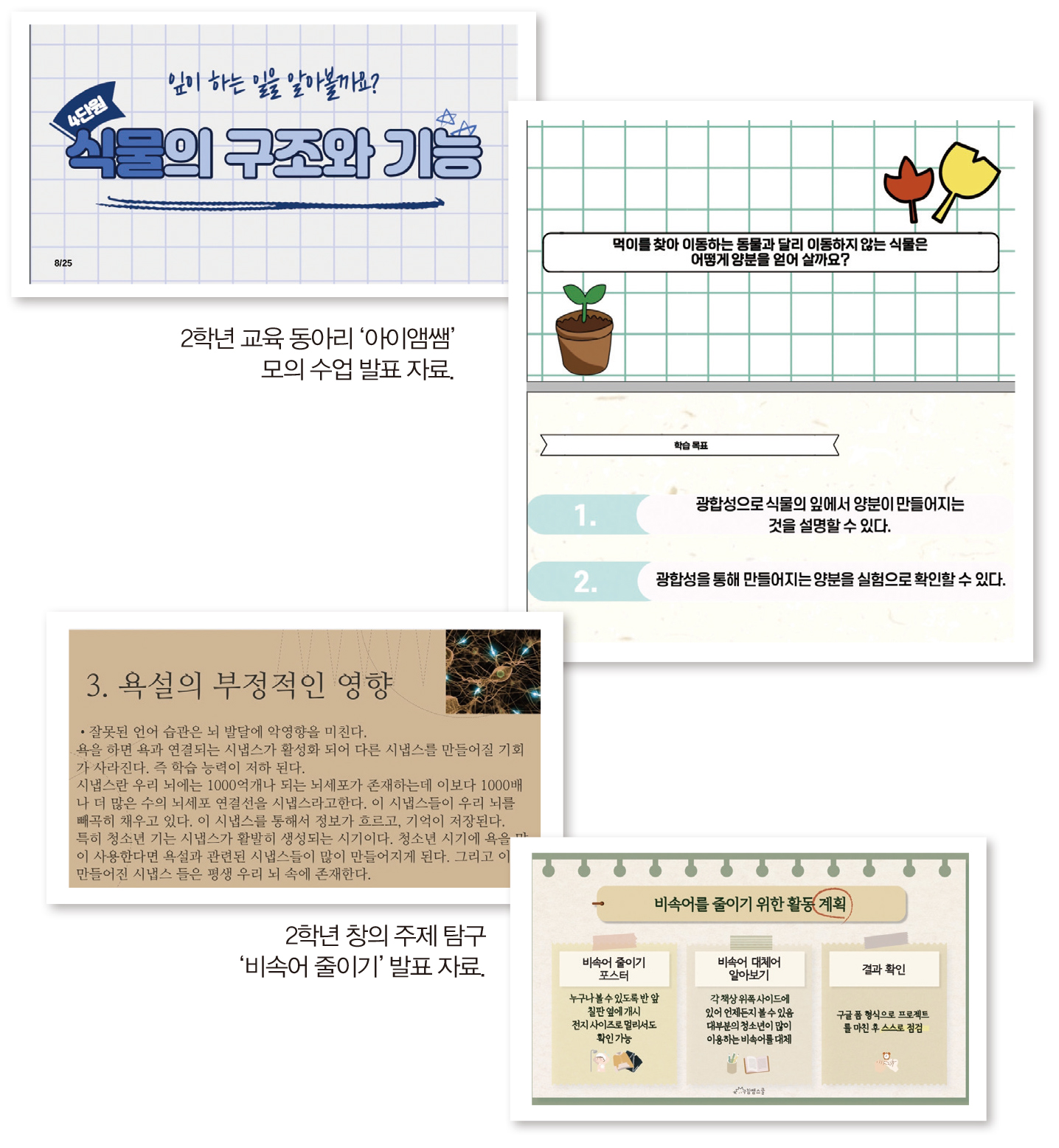 “기존의 초등 과학 교과서를 참고해서 초등학생이 이해하기 쉽게 실험 사진, 학습 활동 등을 구성했어요. 동아리 부원과 선생님 앞에서 모의 수업을 진행했는데 ‘예시를 들어 쉽게 설명하는 부분이 좋았다’ ‘칠판을 보며 등을 돌려 설명할 때는 집중하기 힘들었다’ 등 구체적인 피드백을 받아 많은 도움이 됐어요.”