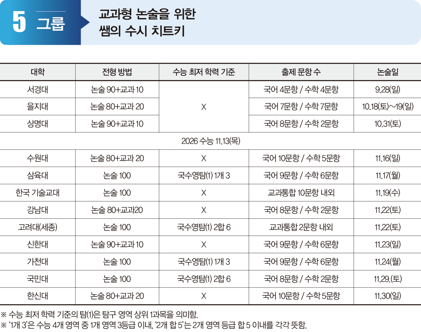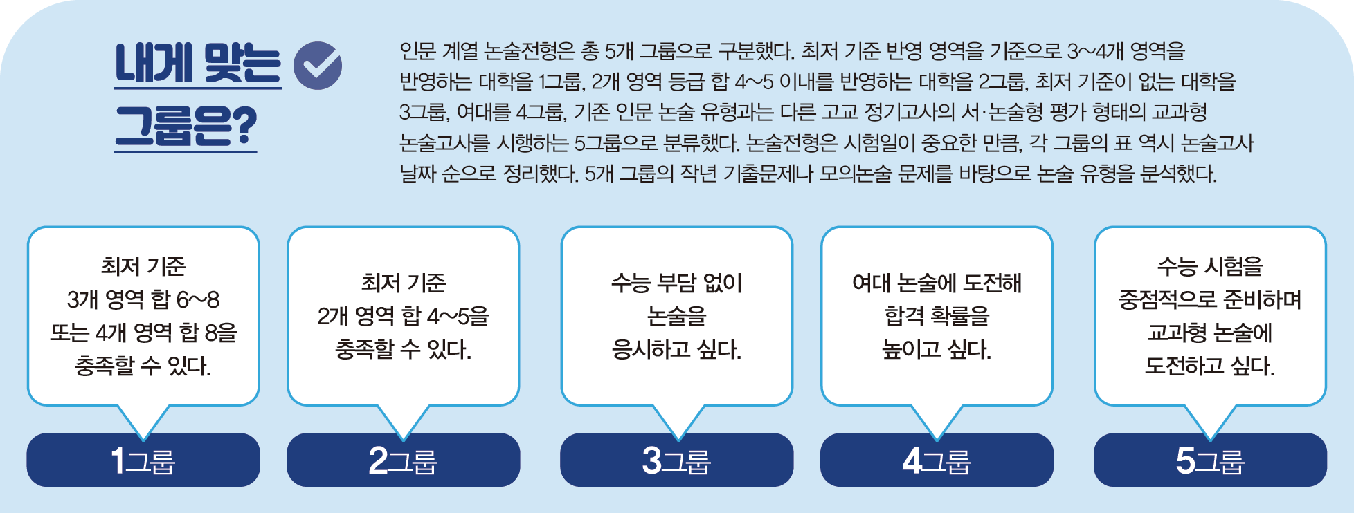 5그룹 대학의 인문 계열 논술전형은 언어 논술의 유형이 아닌 고등학교 정기고사 서술·논술형 문항 형태와 난도로 출제되는 교과형 논술로 진행된다. 대부분 대학이 국어와 수학 문제를 함께 출제한다. EBS 수능 연계 교재를 직접 활용하거나 연계 교재 수준의 지문이나 난도의 문제를 제시하는 경우도 많다. 즉, 수능과 함께 준비할 수 있다.