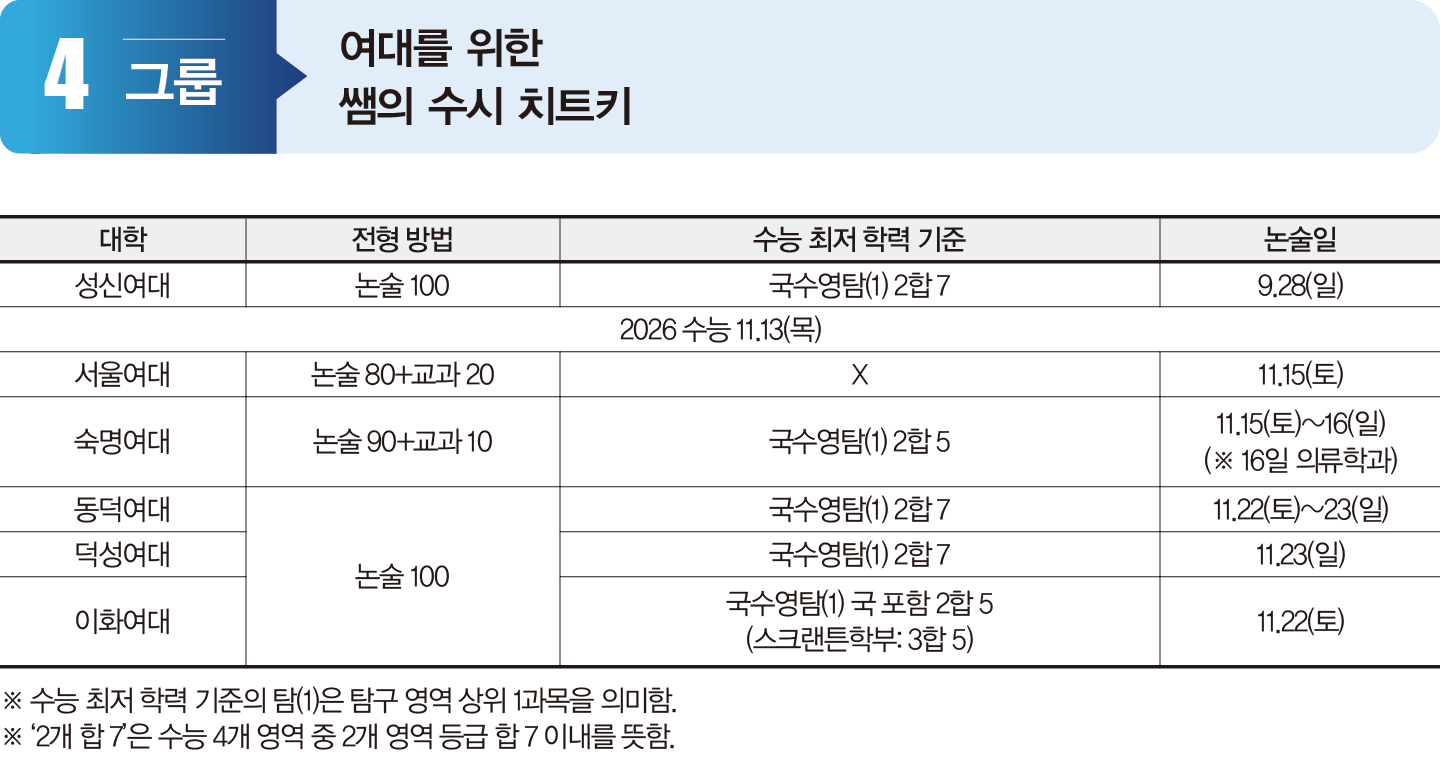 여대 논술전형은 상대적으로 경쟁률이 낮다. 서울여대 외에는 최저 기준을 적용하는 만큼, 최저 기준을 통과하면 합격률이 높아진다. 최저 기준에서 이화여대 스크랜튼학부를 제외하곤 2개 영역을 요구한다. 성신여대는 수능 전인 9월에 논술고사를 실시한다는 점도 눈여겨볼 만하다. 평균 경쟁률은 성신여대 40:1(실질 경쟁률 20:1), 덕성여대 68:1(유아교육과 41.20:1), 동덕여대 29:1, 서울여대 22:1 내외로 알려졌다.