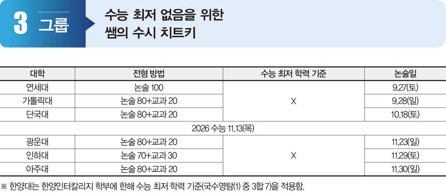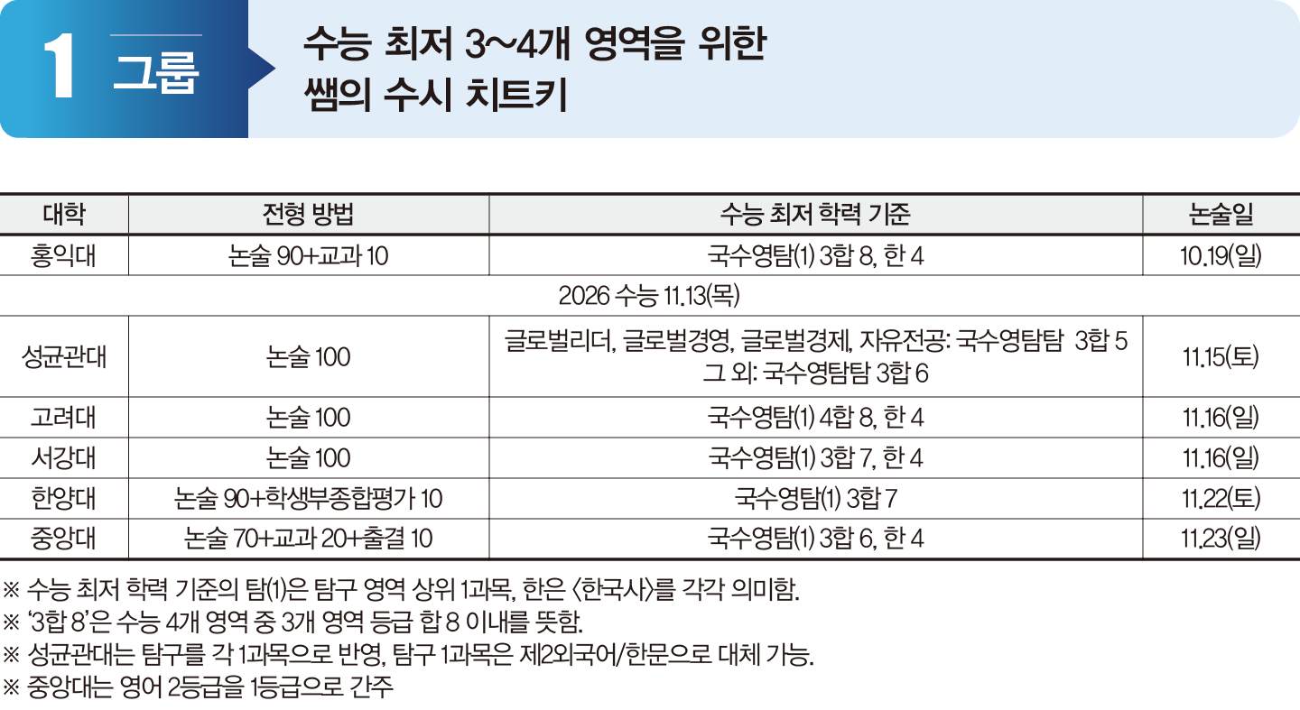 1그룹 대학은 최저 기준에서 반영하는 영역 수가 3개 또는 4개다. 상대적으로 기준이 높아 최초 경쟁률과 최저 기준 충족 및 충원 합격까지 반영한 실질 경쟁률의 차이가 크다. 2025학년 주요 대학의 논술전형 경쟁률을 보면 서강대 최초 경쟁률 평균은 약 90:1이었으나, 실질 경쟁률은 평균 20대 중반 수준으로 낮아졌다. 중앙대도 최초 경쟁률은 약 60~100:1이었지만, 실질 경쟁률은 약 13:1에서 28:1 사이에 형성됐다. 이는 최저 충족 여부가 합격을 결정하는 변수임을 보여준다. 따라서 수험생은 6월과 9월 모의평가 성적을 바탕으로 지망 대학의 최저 기준 충족 가능성을 확인해 지원 전략을 세워야 한다. 홍익대는 수능 전에, 고려대와 서강대는 같은 날짜에 논술고사를 시행하므로 지원 시 유의하라.