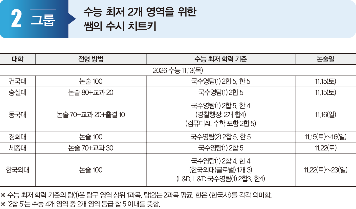 2그룹 대학은 최저 기준에 2개 영역을 반영하며, 수능 이후 주말에 논술고사를 실시하는 공통점이 있다. 1그룹보다 최저 기준이 낮아 최초 경쟁률과 실질 경쟁률의 차이가 적다. 하지만 대학·학과마다 최저 충족률의 편차가 크다. 건국대 최저 충족률은 50~60%였으며, 실질 경쟁률은 20:1 내외였다. 숭실대는 40~60%의 충족률을 나타냈으며, 실질 경쟁률은 10:1 내외였다. 동국대 역시 최초 경쟁률은 60:1 내외에서 형성되지만, 실질 경쟁률은 20:1 내외로 낮아진다. 경희대는 평균 최저 충족률이 20~30%로 낮은 편이며, 특히 러시아어학과가 14.7%로 평균을 훨씬 밑돌았다. 실질 경쟁률은 10:1~20:1이었다. 세종대는 35% 내외의 충족률을 나타내며, 실질 경쟁률은 20:1 내외에 형성됐다. 한국외대는 최저 기준이 2개 영역 등급 합 4 이내로 상대적으로 높아, 지원 경쟁률(50:1 내외)과 달리 실질 경쟁률은 10:1 내외로 크게 하락한다. 같은 대학에서도 학과에 따라 경쟁률 편차가 크므로 지원 시 고려하라.