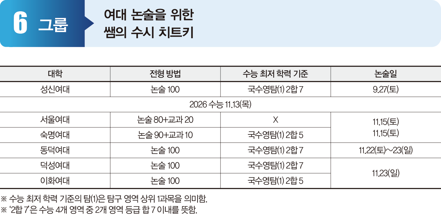 여대 논술전형은 상대적으로 경쟁률이 낮아 최저 기준을 통과하면 합격 확률이 높아진다. 또한 문제 출제 경향이 일관되고 문제의 난도도 평이하다. 기출문제를 집중적으로 연습한다면 좋은 결과가 기대된다.