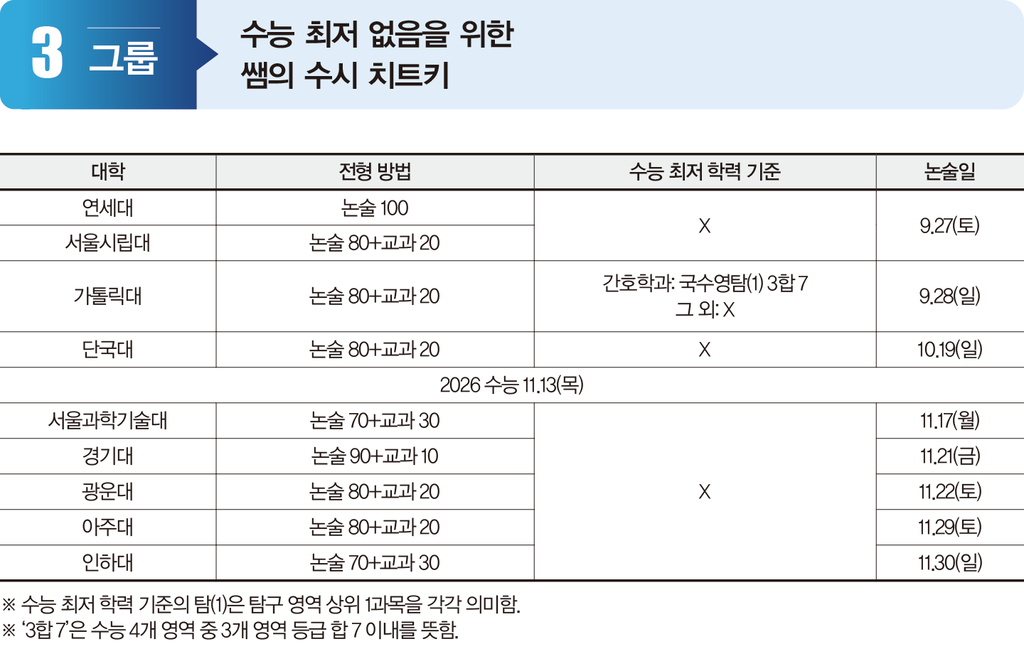 최저 기준이 없어 수능 성적이 예상한 만큼 나오지 않는 경우 3그룹의 대학에 지원한다면 수시 합격의 가능성을 살릴 수 있다. 이 점을 수시 6회 지원 시 전략적으로 고려해야 한다. 수능 성적을 요구하지 않아 교과 성적을 반영하는 대학이 많다. 이 경우 자신의 교과 성적을 대학 환산점으로 산출해보고 논술 성적으로 이를 만회할 수 있는지 꼭 살펴봐야 한다.