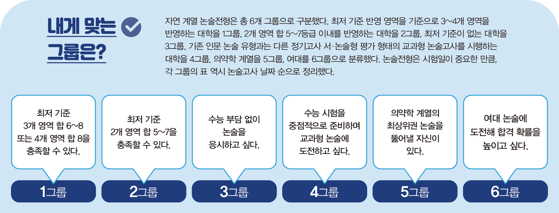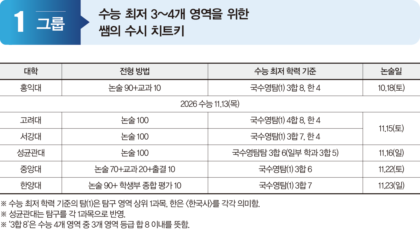 1그룹 대학은 학생 선호도가 높은 만큼 경쟁률도 상당히 높지만 최저 기준을 고려한 실질 경쟁률은 크게 감소한다. 예를 들어 2025학년 고려대의 논술전형의 최초 경쟁률은 64.88:1을 기록했으나 입학처 공개 논술 결시율 57.2%와 응시자의 최저 충족률 51.7%를 반영한 실질 경쟁률은 9.13:1이었다. 따라서 6, 9월 모의평가 성적이 희망 대학의 최저 기준을 충족하는지 확인한 후 지원을 고려해야 한다.