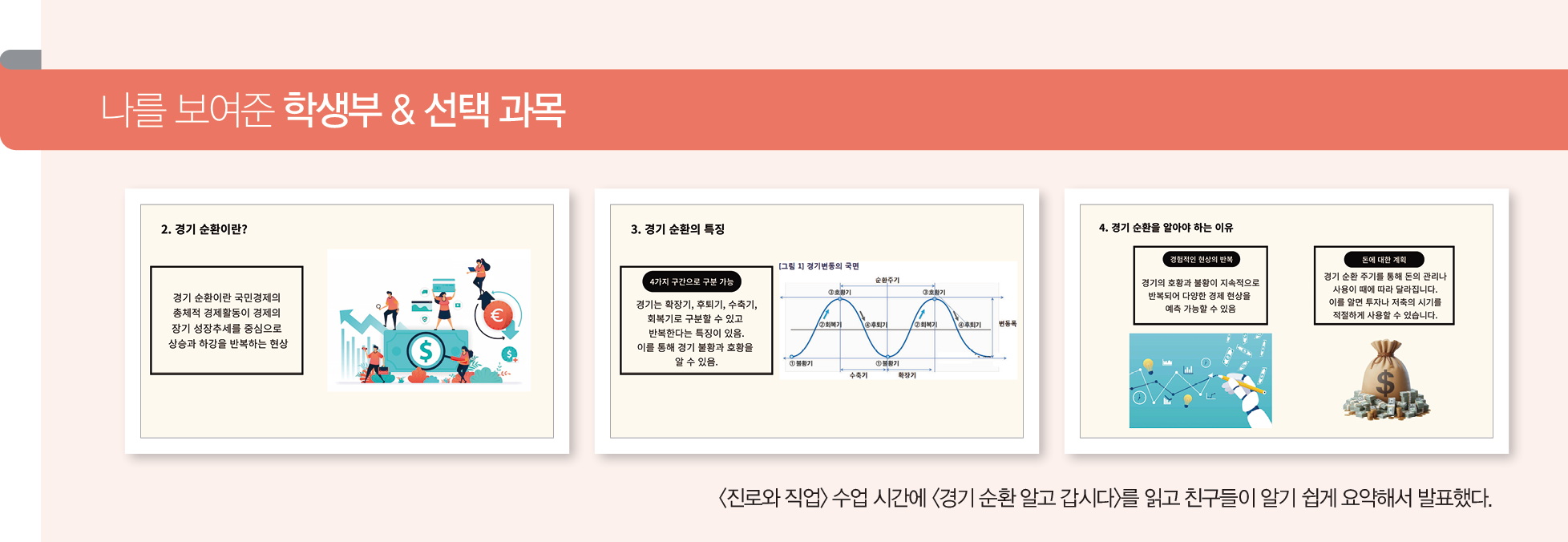 <진로와 직업> 돈과 경제에 대해 효과적으로 설명해주는 사람, 사업과 투자를 판별할 수 있게 도움을 주는 사람, 경제 활동의 방향성을 알려주는 사람에 대한 필요성을 느껴 ‘경제 판별사’라는 직업을 설계해봄 <환경> 기후변화와 물가 상승의 관계를 주제로 보고서를 작성함 <확률과 통계> 기사 속 통계 찾기 활동에서 통계에 잘못된 정보가 있을 가능성을 언급함