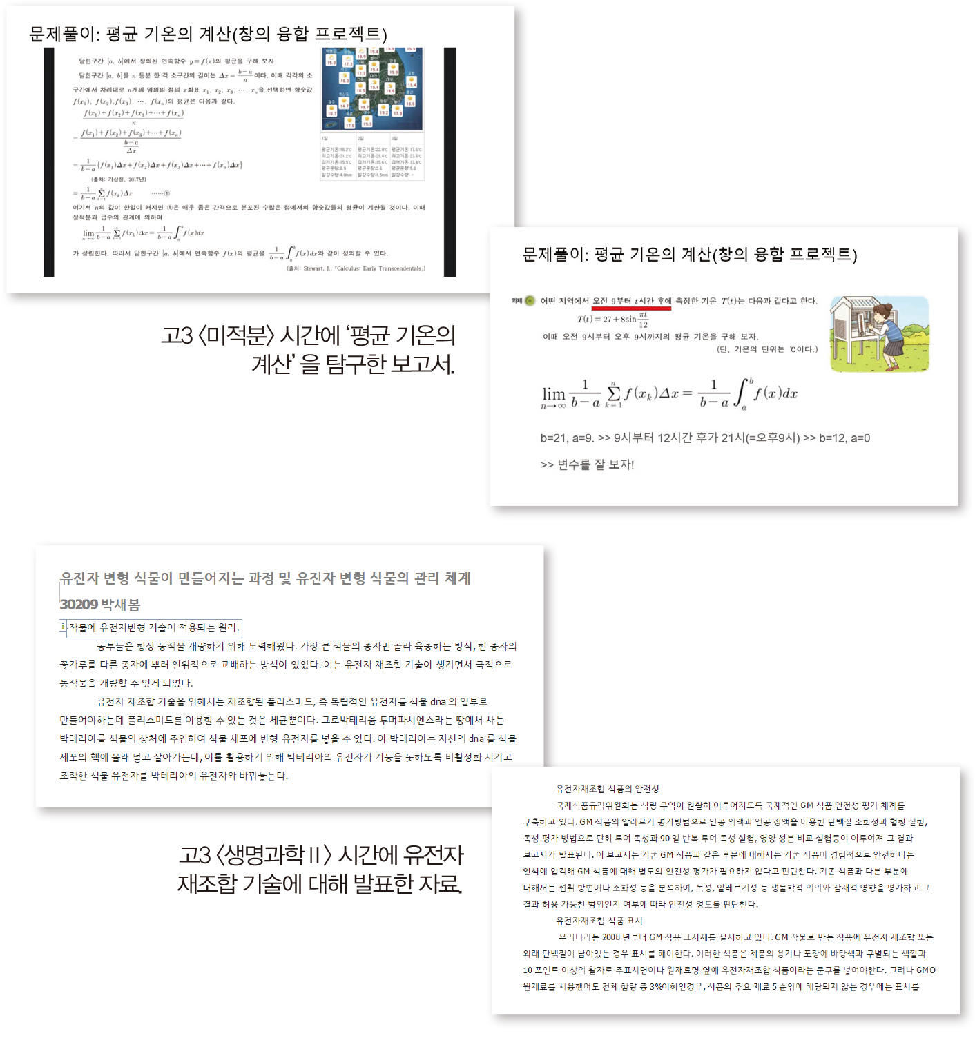 “수업을 들을 때 다양한 과목을 연결하려고 늘 고민했어요. <미적분>에서 배운 극한 개념을 <지구과학>의 기후 통계에 적용한 게 대표적이에요. ‘환경 분야에서 수학을 어떻게 활용할 수 있을까’라는 궁금증이 생겨 일평균 기온과 실효 습도 계산법을 조사했고, 4일간 상대 습도의 평균을 극한 개념으로 확장해 기후 데이터 해석에 응용해봤어요. 단순한 개념 이해를 넘어서 보건·환경 정책에 필요한 분석력도 함께 키울 수 있어서 의미 있었어요.” 과학 과목에서는 기초 개념을 산업화, 정책, 식품 안전, 생명 윤리 등 여러 분야로 확장해 융합한 부분이 눈에 띈다.