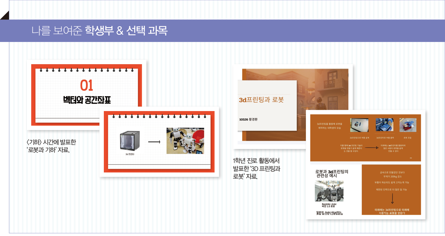 이를 2학년 <화학Ⅰ>의 탐구 활동으로 확장해 ‘화학의 유용성에 대한 조사 보고서’를 작성했다. 3D 프린팅의 화학 요소를 정리하고 로봇 부품 제작에 활용되는 사례를 조사했으며, 플라스틱 소재의 분자 구조와 성질 차이를 분석해 로봇 부품에 적합한 소재를 탐구했다. 대학 진학 후 컴퓨터를 활용해 설계·제도를 배우는 CAD 수업을 들으며 고등학교 때 했던 탐구의 연장선에서 심화된 공부를 할 수 있었다.