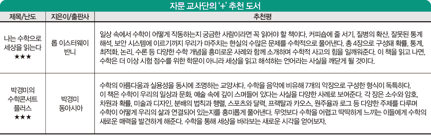 | [쌤과 함께! 교과 연계 적합書] 수학 ② 수학으로 보는 세상 (0) | 2025.12.03 |