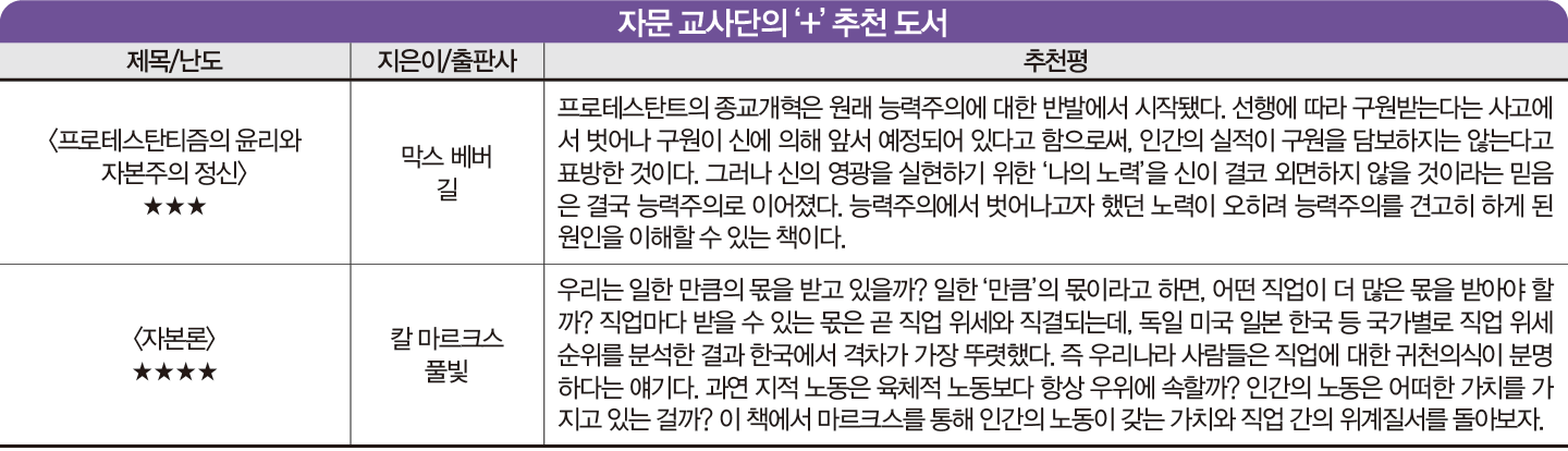 “현대 자본주의 사회는 얼마나 공정한가요? 노력한 만큼의 성과를 얻는 사회는 정말 공정한 것일까요? 마이클 샌델은 ‘누구나 자기 운명의 주인이 될 수 있고 자수성가할 수 있다’라는 말의 뒷면을 지적합니다. 하버드대·스탠퍼드대 학생 중 3분의 2는 소득 상위 5분위 가정 출신이며, 아이비리그 학생 중 하위 5분위 출신자는 4%도 되지 않습니다. 샌델은 능력주의의 이면에 숨은 학벌주의, 그 학벌 속에서 우위를 차지하려는 경쟁주의, 학력을 개인 탓으로 돌리는 업적주의를 지적합니다. 이 책을 읽고 능력주의의 맨 얼굴을 직시하면서 한국 사회가 나아갈 방향을 고민해봅시다.”_ 자문 교사단