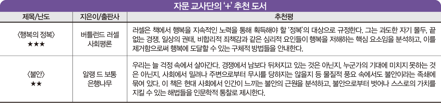 “명예, 부, 권력 등 모든 욕구가 충족되면 우리는 진정으로 행복해질까요? 아리스토텔레스는 행복을 단순한 쾌락이 아닌 ‘덕에 따른 영혼의 활동’, 즉 인간이 자신의 능력을 가장 탁월하게 발휘하며 살아가는 과정이라고 말합니다. 책은 ‘어떻게 살아야 잘 사는 것인가’라는 근본적인 질문에 답하며, 인간의 삶의 유형을 분류하고 무엇이 궁극적 행복이 될 수 있는지 설명합니다. 또한 진실·우정·분노·수치 같은 일상적 감정과 덕목이 행복과 어떻게 연결되는지도 알려줍니다. 긴 세월, 인류에게 삶의 방향을 제시해준 지침서를 읽으며 지금 우리가 추구해야 할 진정한 행복인지 묻고 답하는 시간을 가져보길 바랍니다.”_ 자문 교사단