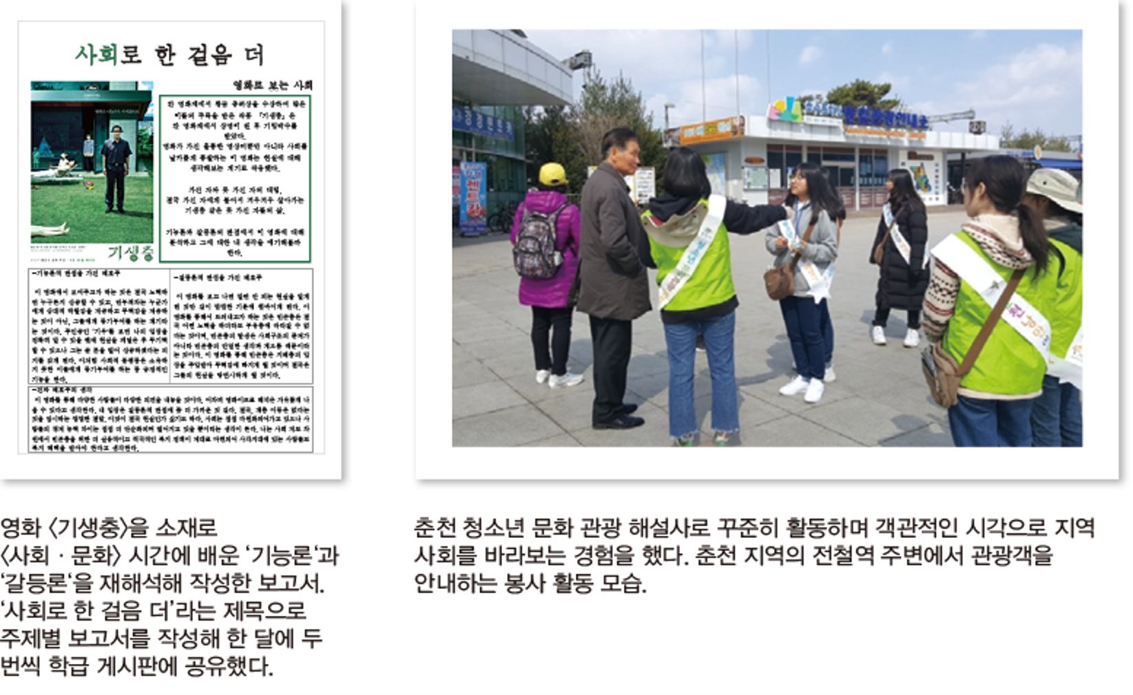 칸 국제영화제에서 황금종려상을 받은 영화 <기생충>을 주제로 기능론과 갈등론을 재해석한 것을 비롯해, 당시 인터넷 실시간 검색어 순위에 오른 ‘일본 불매 운동’에서 착안해 왜 이런 현상이 빚어졌는지 분석하고 자신의 의견과 입장을 정리해 ‘사회로 한 걸음 더’라는 제목으로 보고서를 작성하기도 했다. 2주에 한 번씩 보고서를 만들 때마다 학급 게시판에 붙여 친구들과 공유했다.