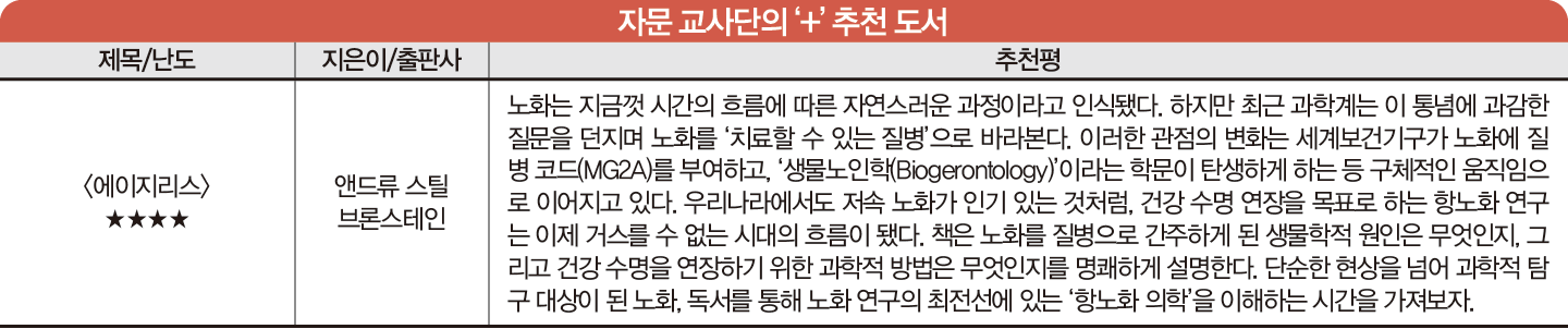 | 한걸음 더 ✔︎ 암과 질환에 걸리지 않고 노년의 건강을 유지하는 데 필요한 노력을 식단과 생활 습관으로 나누어 정리하기 ✔︎ 발생생물학을 바탕으로 수명을 연장하고 신체를 젊게 되돌리는 미래 기술을 구상하기 ✔︎ 노년을 ‘쇠퇴’가 아닌 ‘새로운 세포로 대체되는 성장’으로 바라볼 때, 우리가 설정해야 할 인생 후반기의 성장 목표에 관해 토론하기 |