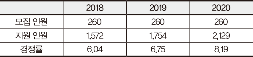 추천 전형으로 바뀌어 전국 각지의 고등학교에서 지원하리라 기대한다. 특정 지역이나 특정 학교에서 합격자가 쏠리지 않고 다양한 학생이 합격하기를 바라며, 모집 인원도 2배 늘었으니 적극적으로 지원할 것을 권한다. 면접은 수험생의 부담을 줄이기 위해 2020학년 제시문 기반 면접+활동의 자기 주도성 및 창의적 해결 능력 확인이라는 두 가지 방식에서 2021학년에는 학생부와 자기소개서를 기반으로 한 확인 면접 한 가지 방식으로 변경됐다. 올해도 수능 전 면접을 실시할 예정이다.