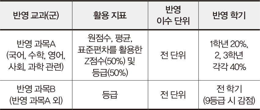 각각의 점수가 갖고 있는 단점을 보완하기 위해서다. 90점으로 1등급을 받고 89점으로 2등급을 받았다고 하자. 점수 차이는 크지 않지만 등급이 달라졌다. 90점으로 1등급을 받고 99점으로 1등급을 받았다고 하자. 점수 차이는 크지만 등급은 같다. 학생부 교과 점수를 등급으로만 반영하면 이런 문제점이 있으므로 Z점수를 함께 반영한다. 그러나 면접형은 1단계에서 학생부 교과는 40%, 서류 평가는 60%이므로 서류 평가의 비중이 더 높다. 교과 성적은 40%를 이미 반영하므로 서류 평가에서 중복해 평가하지 않는다.