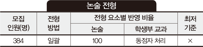 서술형 논술형 교육을 존중하며, 다양한 전형으로 다양한 학생을 선발하고자 한다. 인문 계열은 전체 모집 인원의 10%, 자연 계열은 20% 안팎을 유지하되, 인원이 적은 모집 단위는 논술 전형으로 선발하지 않는다. 올해도 작년처럼 모의 논술을 실시할 예정이다. 인문 계열은 예전과 마찬가지로 영어 제시문·과학 관련 제시문·수리 통계 자료가 포함될 수 있다. 자연 계열은 물리·화학·생명과학·지구과학 중 모집 단위에 따라 1~4과목을 지정했으니, 원서 접수 시 본인이 응시할 과목을 선택해야 한다.