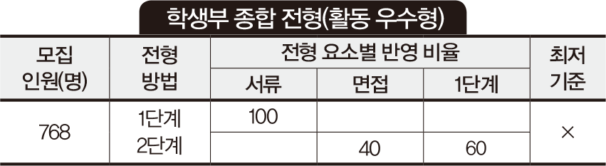 활동 우수형뿐만 아니라 면접을 실시하는 모든 전형에 대해 면접 문제를 고민 중이다. 올해 상반기 중 입학처 홈페이지에 면접 유형을 구체적으로 안내할 예정이니 반드시 확인해보기 바란다. 종합 전형 활동 우수형은 올해까지 추천서를 유지하지만 내년부터는 없어진다. 종합 전형 중 활동 우수형·국제형·기회 균형은 중복 지원이 안 되며 이 중 하나에만 지원해야 한다.