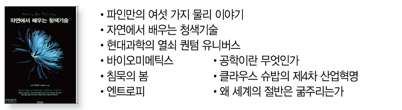 “과학 심화 수업 발표를 준비하면서 태양전지에 특정한 입자 구조로 된 막을 씌우면 햇빛이 더 잘 흡수된다는 것을 알게 됐어요. 입자 구조를 응용하면 빛을 통해 세상을 보는 우리 눈에 도움을 주는 장치를 만들 수 있겠더라고요. 나노소재 연구원을 꿈꾼 계기였죠. <자연에서 배우는 청색기술>은 막연했던 꿈에 방향성을 부여해준 책이에요. 인간이 자연의 신비로움을 모방해 기술로 승화시킨 사례들이 담겨 있어요. ‘염료 감응 태양 전지’는 몸 표면의 화학 물질로 태양 에너지를 흡수해 사용하는 동양말벌에서 아이디어를 얻은 거죠. 자연을 현명하게 모방하려는 시도로 인간의 기술이 도약할 수 있을 거라 생각했어요.”