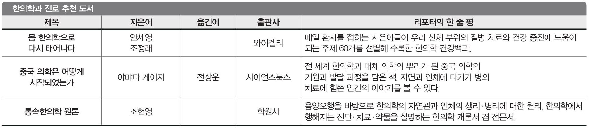 책을 펴낸 와이겔리 조동욱 편집자는 “한의학자들은 세상 만물을 구성하는 음양오행을 이해하는 것이 동양학을 이해하는 나침반이 된다고 한다. 이 책은 한의학을 시작하고 비슷한 문제로 고민하던 한의사가 쓴 동양학 입문서다. 음양오행을 너무 과학적이거나 미신적인 시각이 아니라 이치에 맞게 설명하고 있다는 점에서 여타 동양사상 책들과 차별화된다. 출간된 지 20년이 넘었지만 여전히 한의학 입문서로 추천되는 이유같다”라고 덧붙였다.