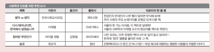 나중에 사회학을 제대로 공부한다면 눈에 보이는 현실에 대한 비판을 넘어 사회 문제의 해결 방안을 찾을 수 있다니 매력적이지 않은가? 그날을 위해 사회 이면을 꿰뚫어보는 눈, 현실에 대한 비판 의식, 사회적 논쟁에 대한 균형 감각을 갖추려 노력하자.