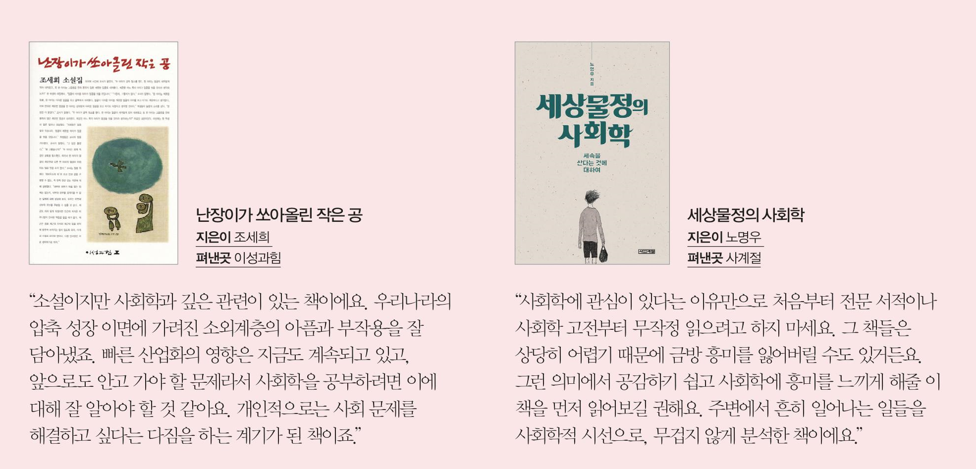 후배들을 위한 책 2권을 꼽는다면 <난장이가 쏘아올린 작은 공> <세상물정의 사회학>을 추천하고 싶네요.
